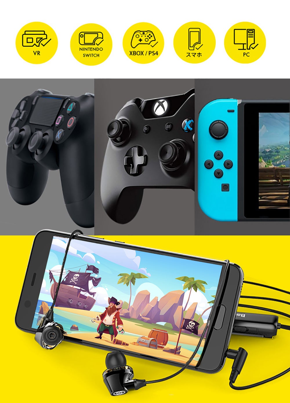 NINTENDO SWITCH・VR・XBOX 360・XBOX ONE・XBOX ONE S・PS4・PS4 Pro及び3.5mmAUXケーブルのあるすべてのモバイルデバイスと互換性があります。