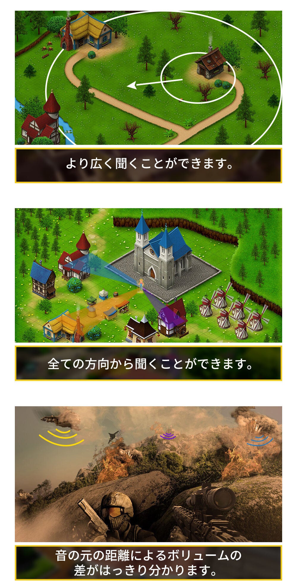 X, Y, Z軸から全ての方向で見えないところからのサウンドを聞くことができます。