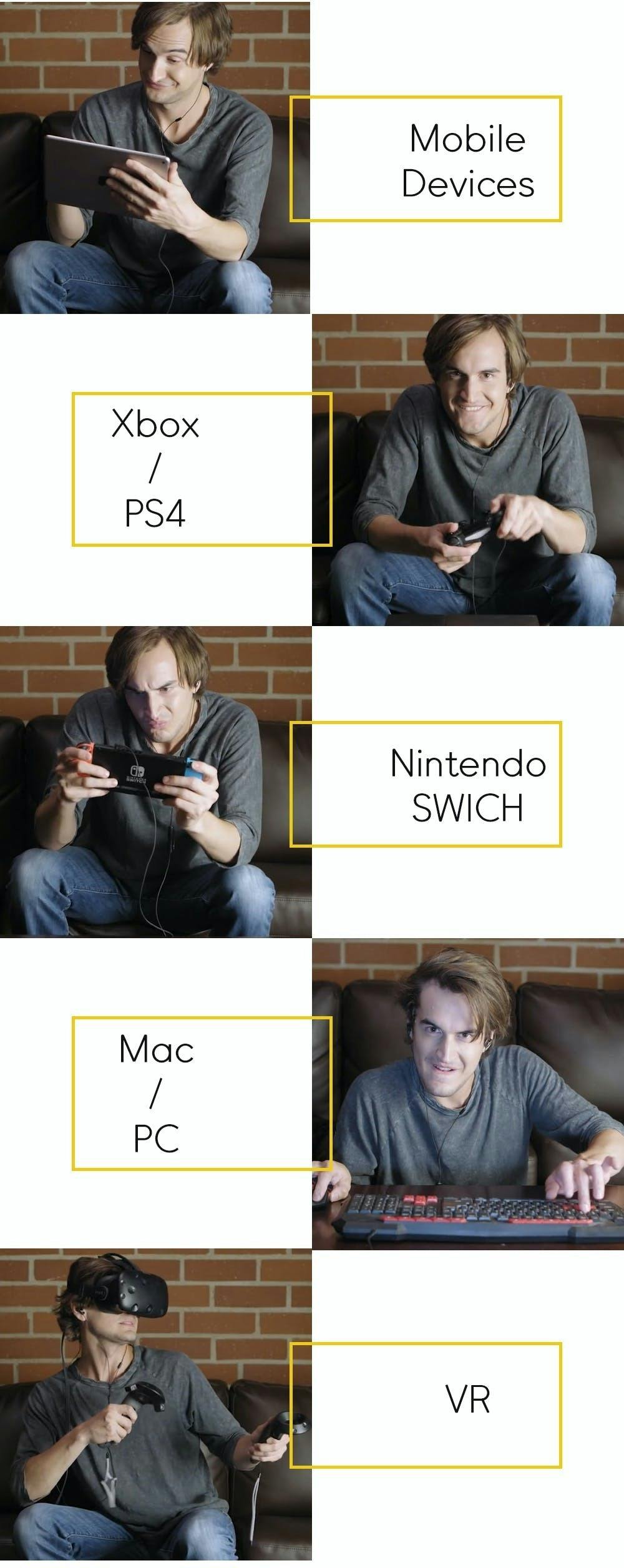 NINTENDO SWITCH、XBOX、PS4、VR及びモバイルデバイスを含め、3.5㎜出力のすべてのデバイスにお使いください。GAMOイヤホンとPC及びMACに使う場合、同梱された3.5㎜オーディオアダプターケーブルを使って連結してください。