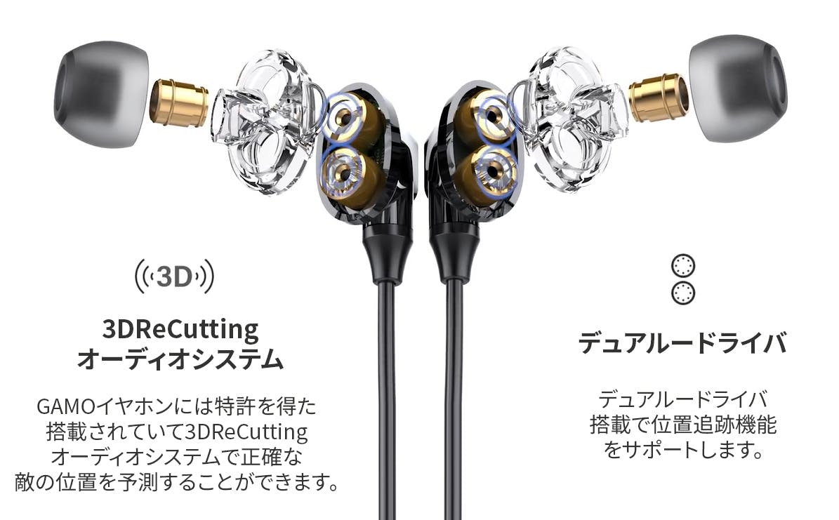 GAMOはきめ細かなサウンドさえ追跡し、強力なデュアルドライバーシステムを通じ耳に情報を伝える革新的なイヤホンです。こうしたディテールは敵を探し、意思決定を速めることができる上、勝利の可能性を高めます。