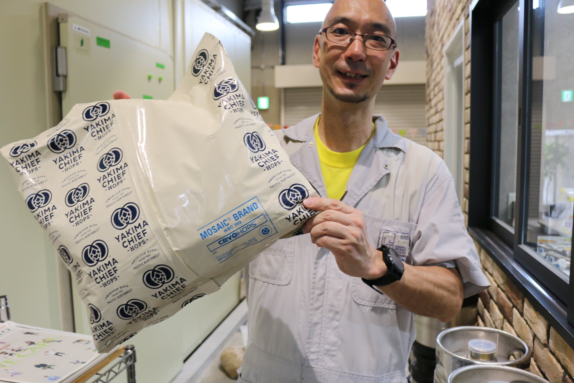 *大量の最高級ホップを手に笑顔のウッドミルブルワリー・京都 辻本氏