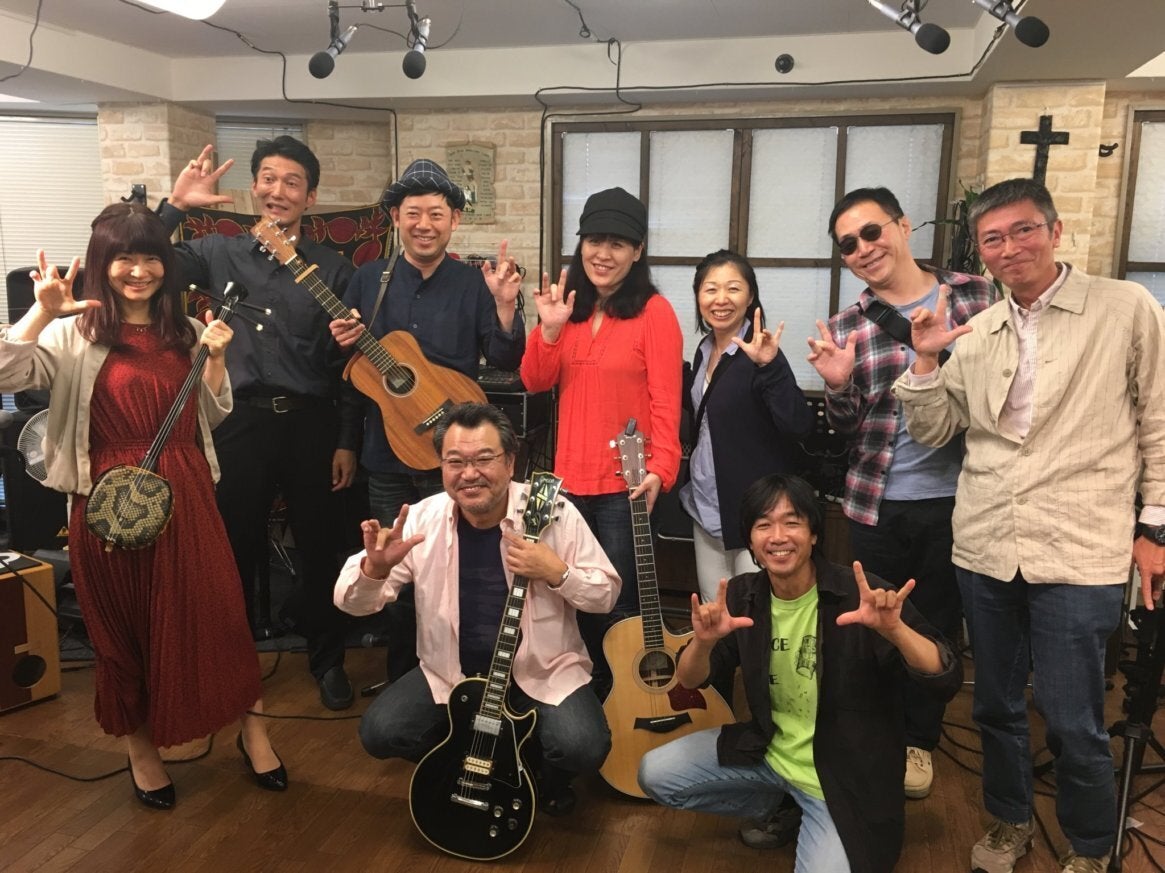 (写真:月曜祝日恒例の「弾き語りコンサート」出演メンバーによる記念写真)