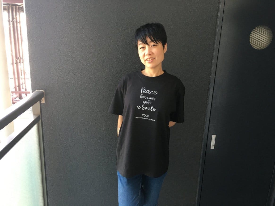 最近、自粛警察とかなんか日本人同士でギスギスした感じになってますけど、そんなご時世だからこそ「平和は一人の笑顔から」というマザーテレサの素敵な言葉をプリントしました。メッセージの下には小さく「Save S.M.S Gospel Studio 2020」と書いています。