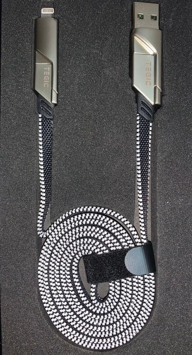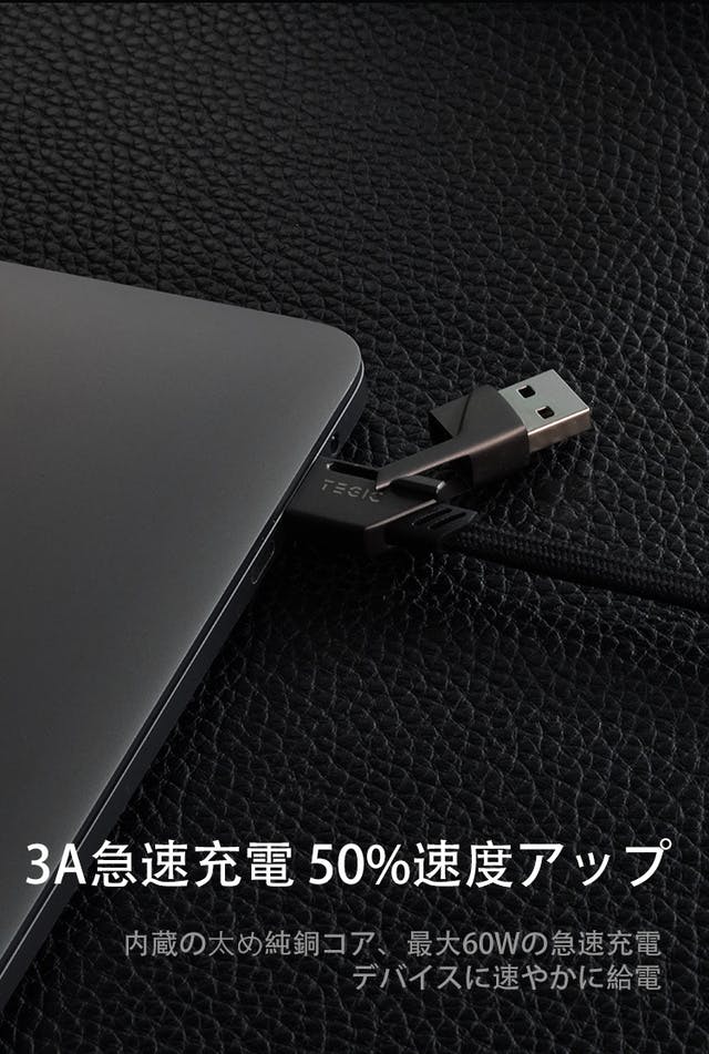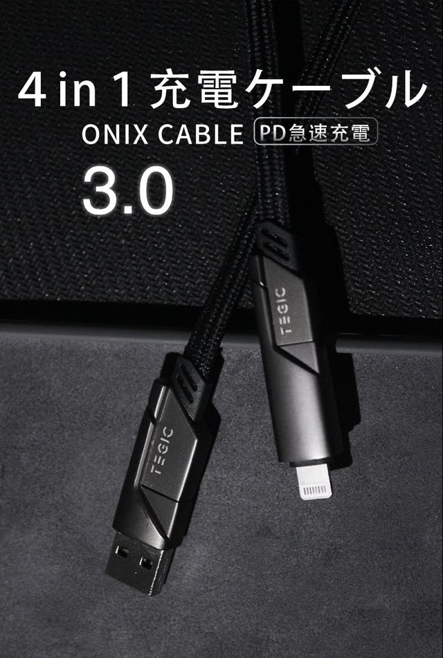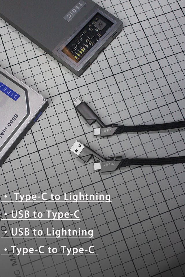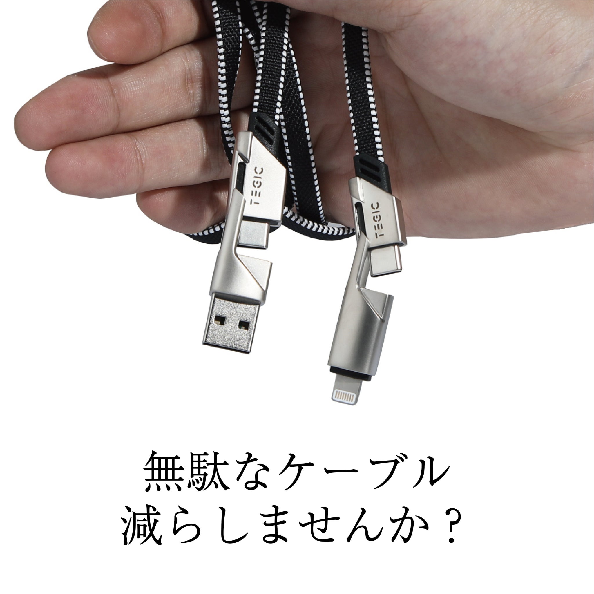 私たちはケーブルを充電するために「ユーザーの習慣を変えない解決策」を開発することにしました。それがTEGIC『4in1充電ケーブル』です。Type-C to Lightning、USB to Type-C、USB to Lightning、Type-C to Type-Cまでをサポートします。