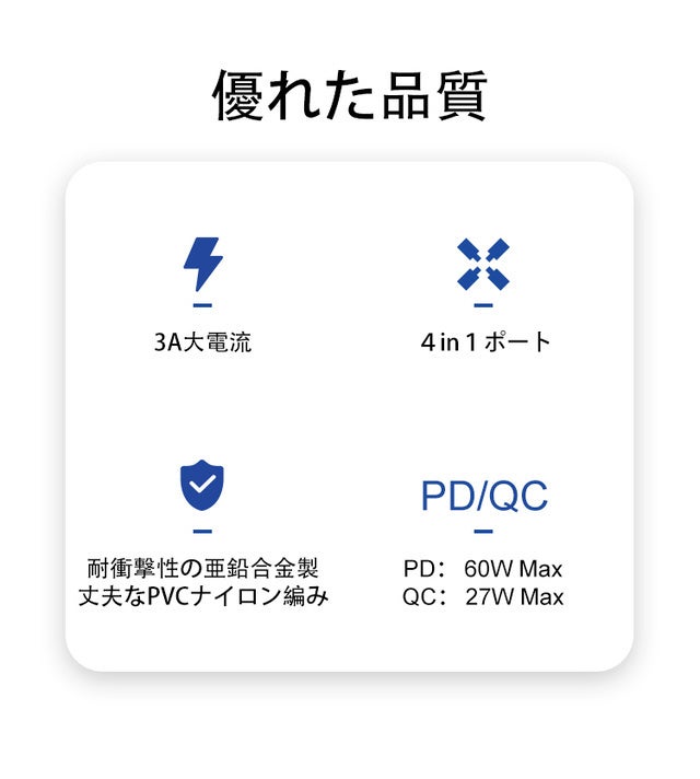 4in1の超多用途の充電&データ転送ケーブルです。何本もの変換ケーブルを持ち歩く手間が省けます。iPhone、iPad、Androidスマホ、Macbook Pro、モバイルバッテリーなど、これ1本で様々な電子機器に対応します。