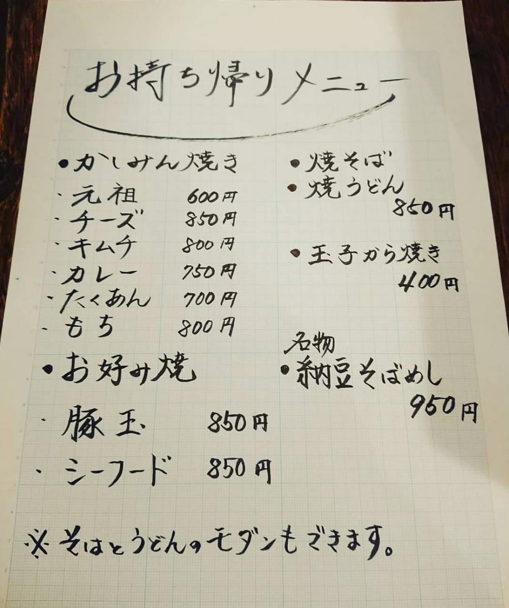 いつものかしみん焼きはもちろんの事。弐箱の裏メニューとして常連さんがよくご存知の豚玉もテイクアウトできます。