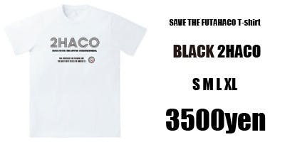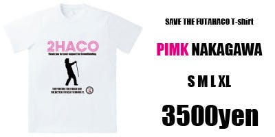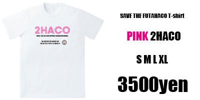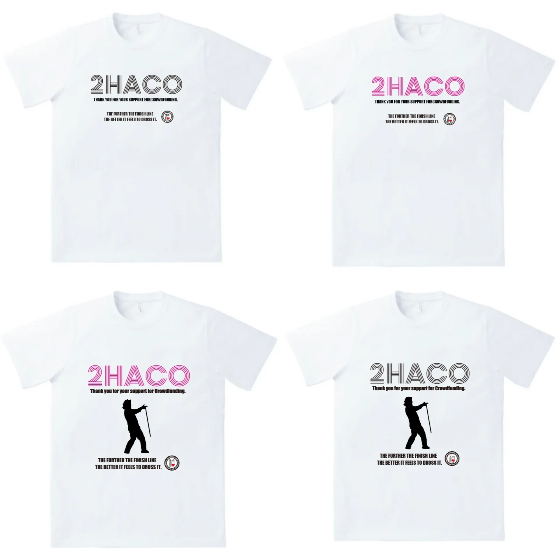 「2HACO」と書いて、「フタハコ」と読みます。SAVE THE 2HACO。クラウドファンディングのお礼の気持ち。そして、この困難の先には大きな喜びが待っている!のメッセージが書いてあります。クラウドファンディング限定のデザインです。お色はピンクとブラックの2種。サイズは、S、M、L、XLの4種になります。