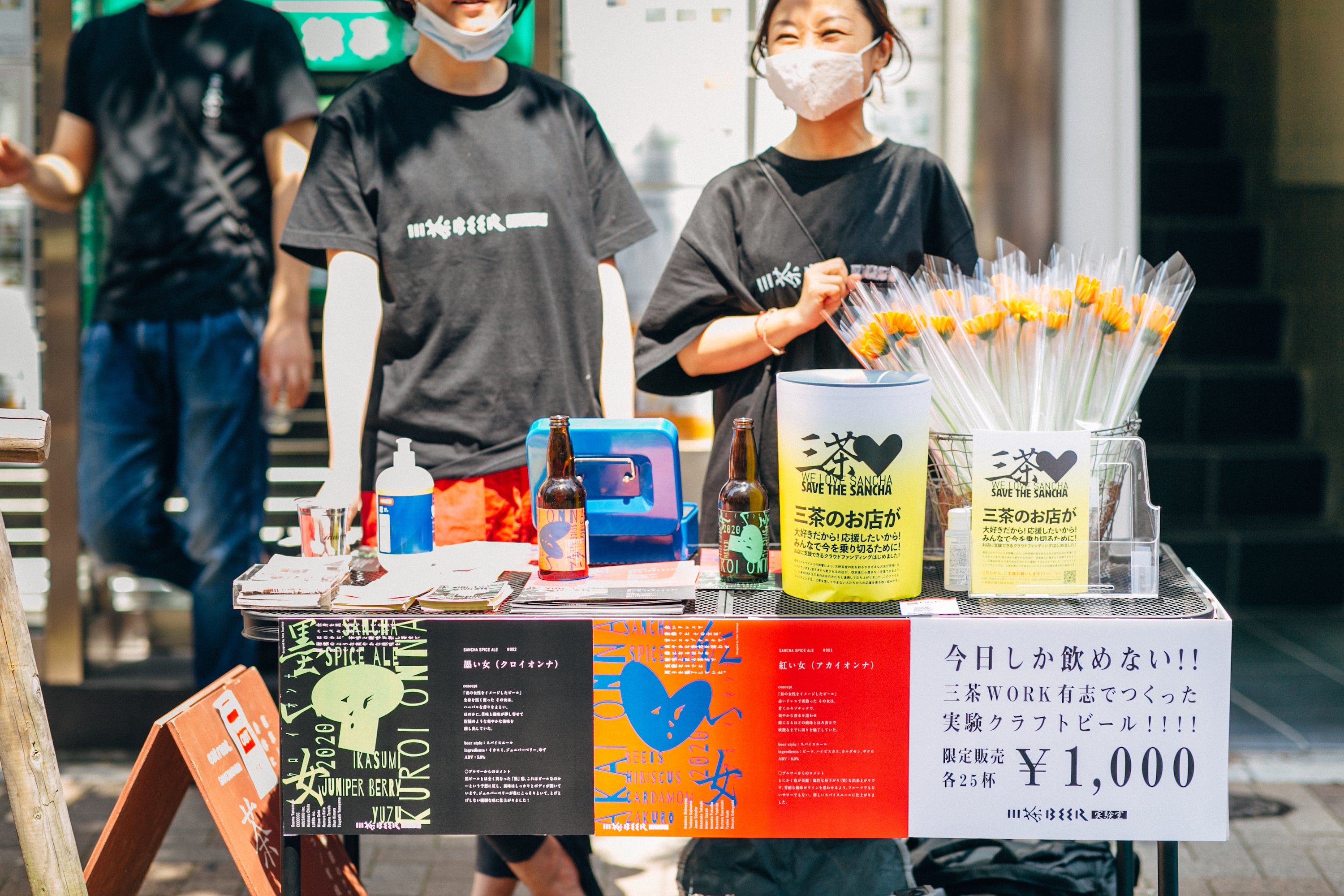2020/06/13 16:13●三茶にエール!スパイスエール!!三茶BEERを1日限定樽生で6月7日(日)、三茶WORK前で三茶BEERを1日限定樽生販売しました。三茶BEERは三茶WORKのメンバー有志20人が集まって、今年の2月から作ってきたクラフトビール。三茶BEERについてはこちらこのビールを三茶のみなさんに味わってもらおう!そして三茶クラファンも一緒に応援してもらおう!ということで、歩行者天国の茶沢通りでイベントを開催しました。晴天の茶沢通りはお散歩や買い物で行き交う人がたくさん。私たちのブースにも次々とお客さまが。ビールが注がれるのをお待ちいただきながらクラファンのお話をしました。SNS上でずいぶんシェアされた三茶クラファンですが、こうして初めて知っていただいた方もたくさんいました。もちろん「先日支援しました!」という方も。本当にありがとうございます!参加店舗の花屋「SHARIMAR」さんが提供してくれたかわいいガーベラをプレゼント。晴れの日にぴったりのビタミンカラーです。そんなこんなでたった2時間で完売御礼!53杯のビール売上&寄付金を合計して、¥101,050頂戴しました!そして、わたしたち三茶WORKはこの売上をすべて三茶クラファンの支援に充てることとしました。三茶クラファン終了まで残り1週間。現在の目標200万円まであと少しとなりました!引き続き、ご支援よろしくお願いします。photography : kanna.photo もっと見る