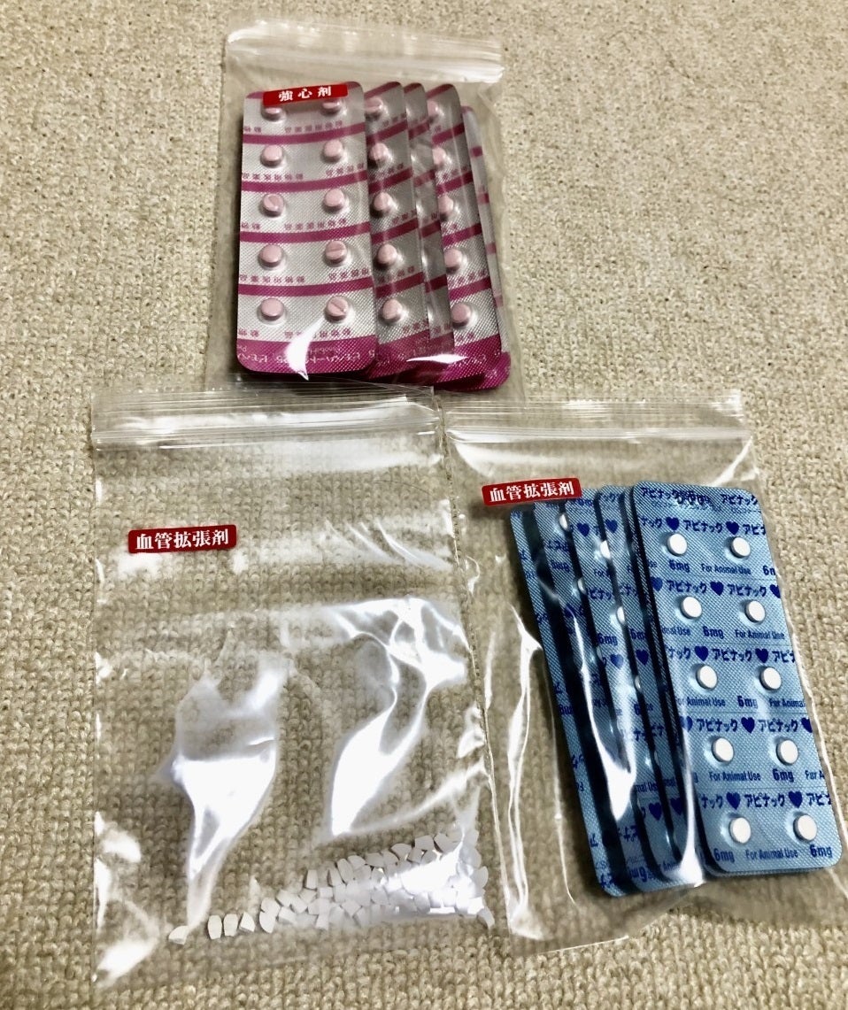 現在、薬は3種類(ピモベハート1回1錠×2、アピナック1回1錠×2、アムロジピン1回1/4錠×2)を処方されています。