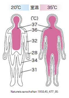 環境温度の影響を受けます。内部の温度(中核温)は、脳や心臓などの大切な臓器の働きを保つため、