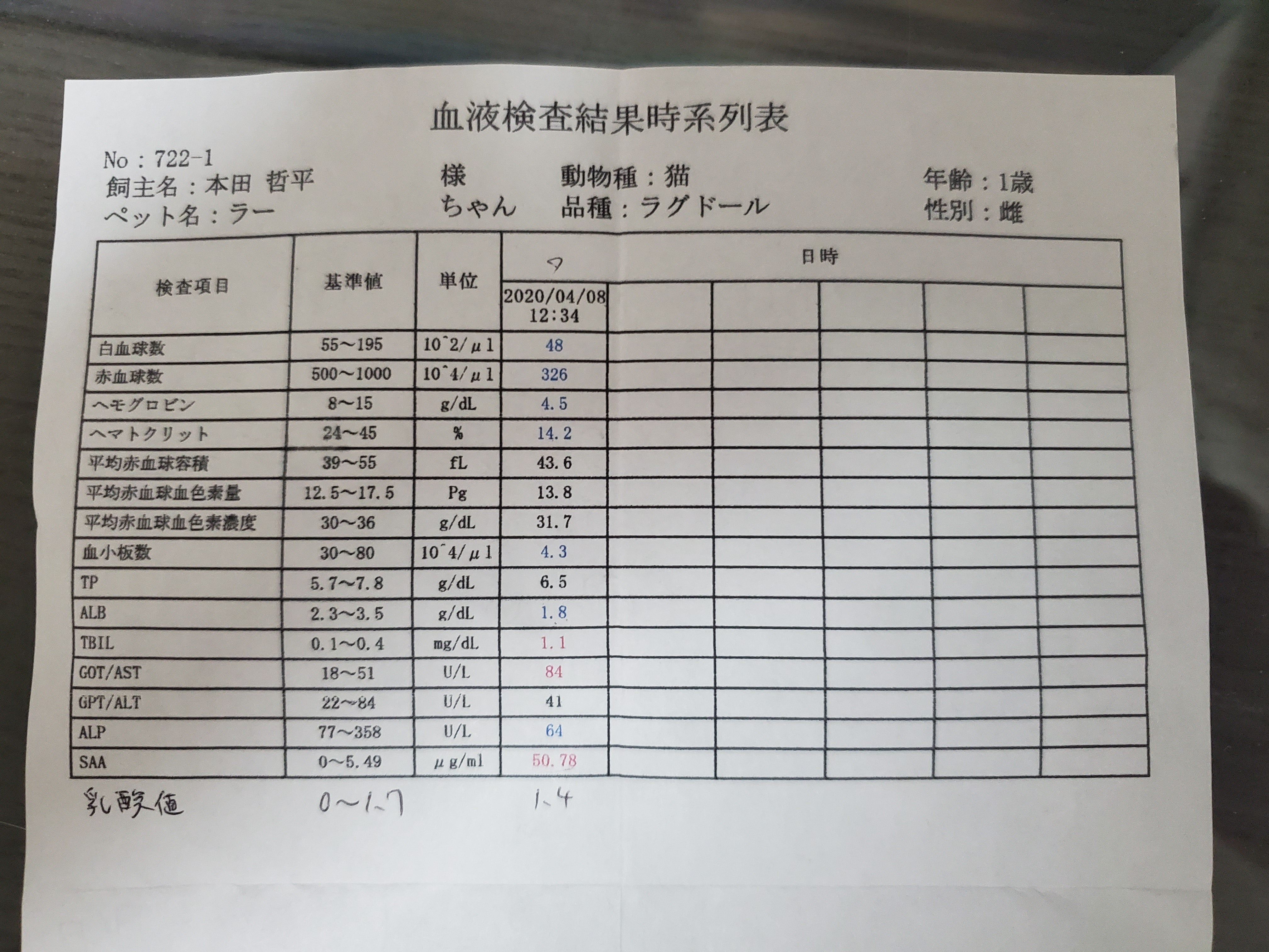 翌日4/8(水)に前日に採取した腹水を持ち、紹介された病院にいくと、FIPであると診断されました。
