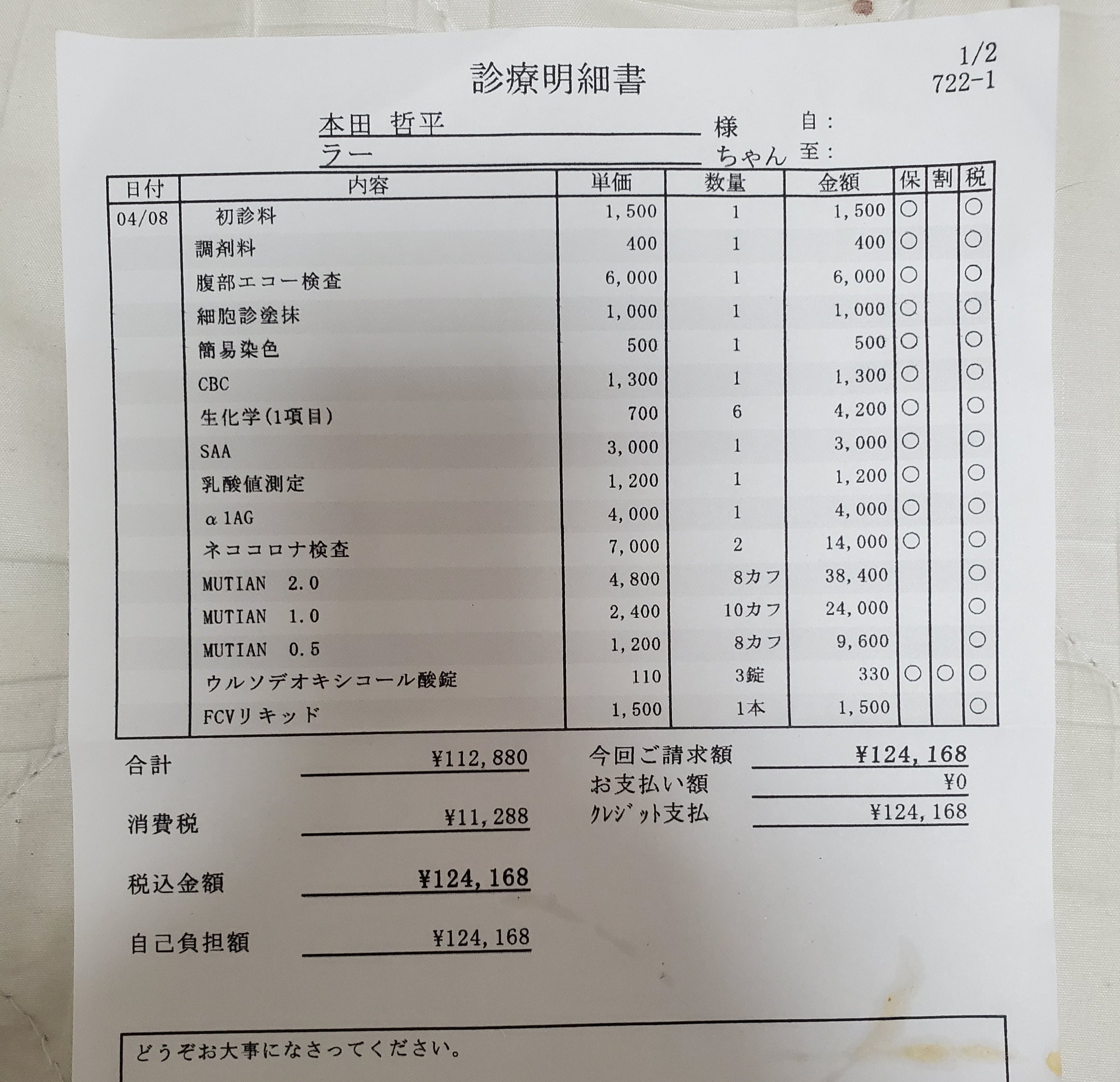 見たこともないラ-の姿にどうしてもおかしいと思い、4/7(火)に動物病院でFIPの可能性があると診断されましたが、そこの病院ではMUTIANは取り扱っておらず、近くの取り扱いのある病院を紹介していただきました。