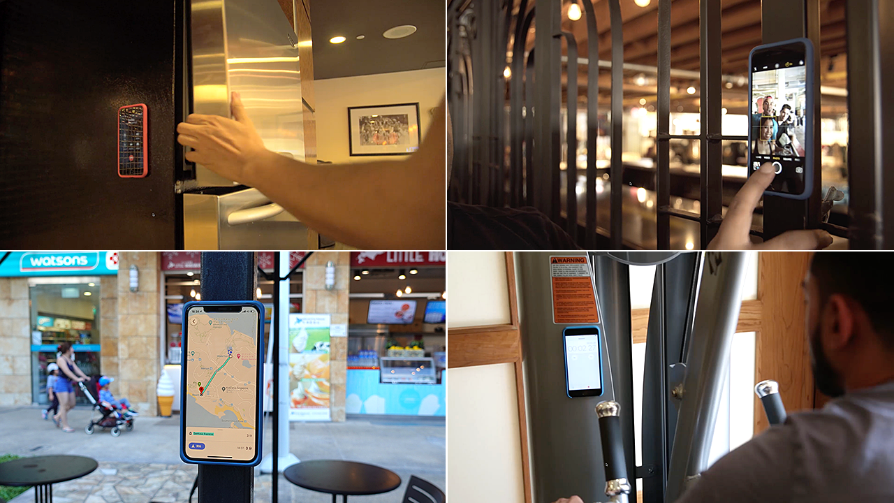 また、MagStickを接着していなくても、例えばスポーツジムのマシンの金属面やバーベルなどの金属面や冷蔵庫など貼り付け可能です。