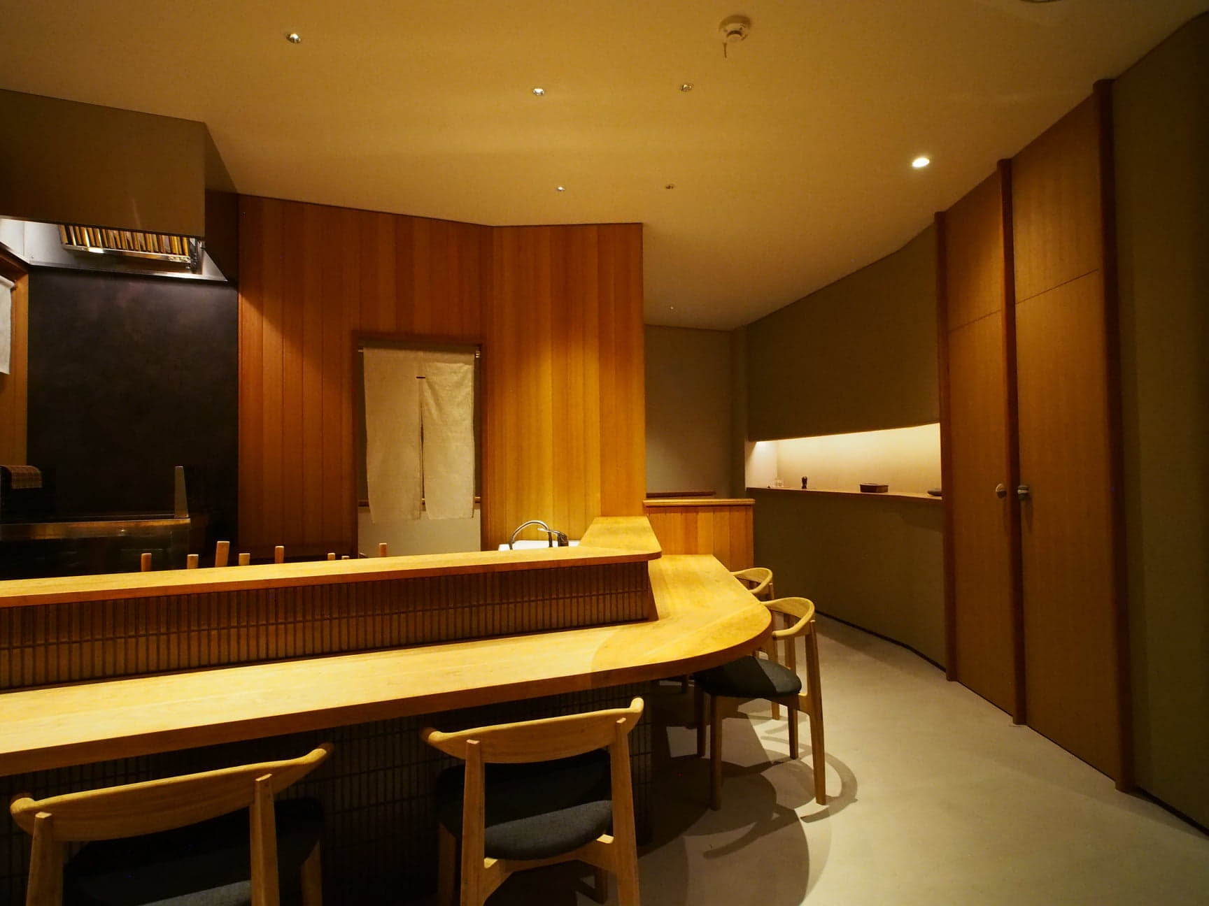 内装はbricole(寄せ集めてつくる)ということをコンセプトにクロークのハンドルには神奈川の海岸で拾った石に籐を巻き、古い日本の棚を塗り直し戸や真鍮のハンドルを付けインテリアとして作り上げたものになります。