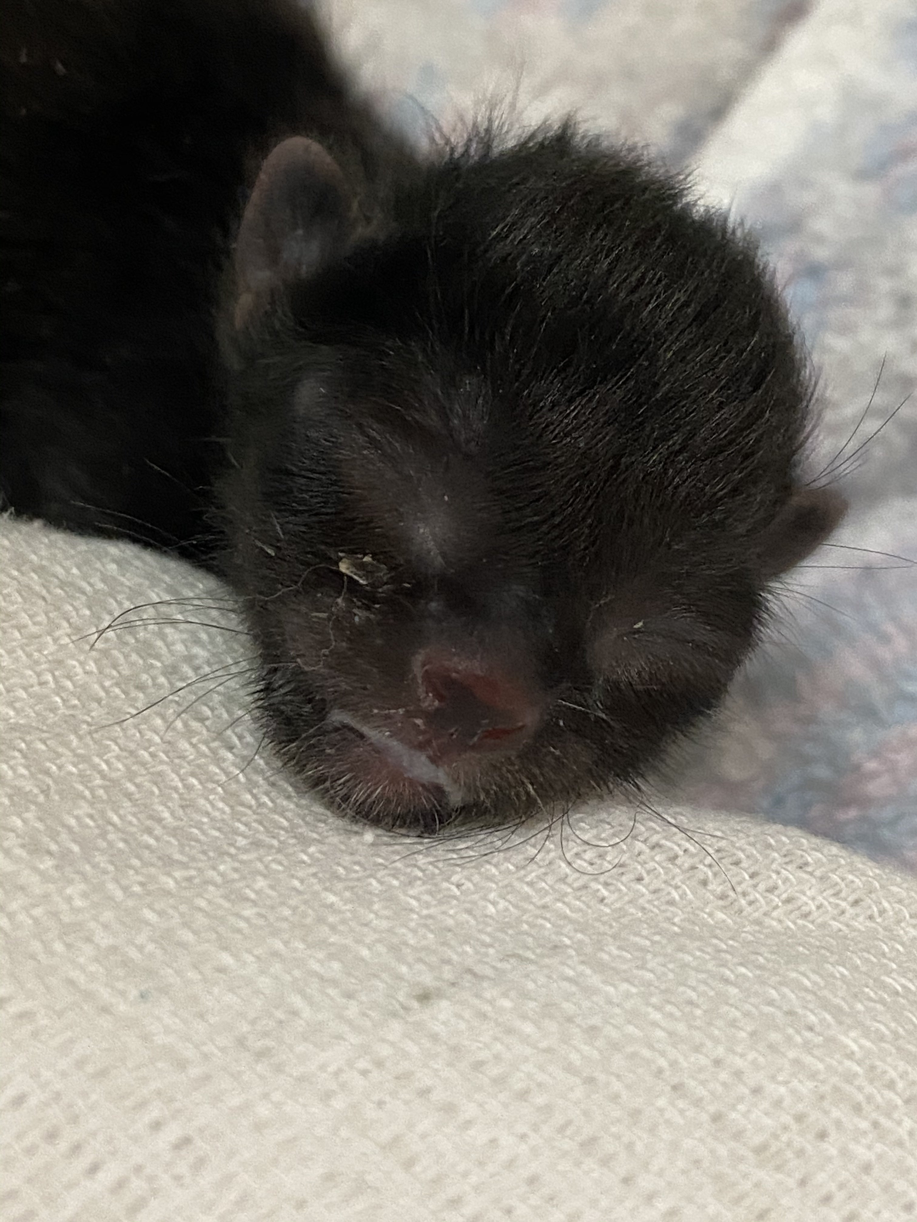 生後2日くらいの赤ちゃんが保護されました。保護主さんからのSOSでした。既に弱っている様子でしたが、低体温にならない様に保温し、ミルクも準備しましたが、自分ではミルクを飲んでくれず、シリンジで一滴ずつ口の中に入れていきました。
