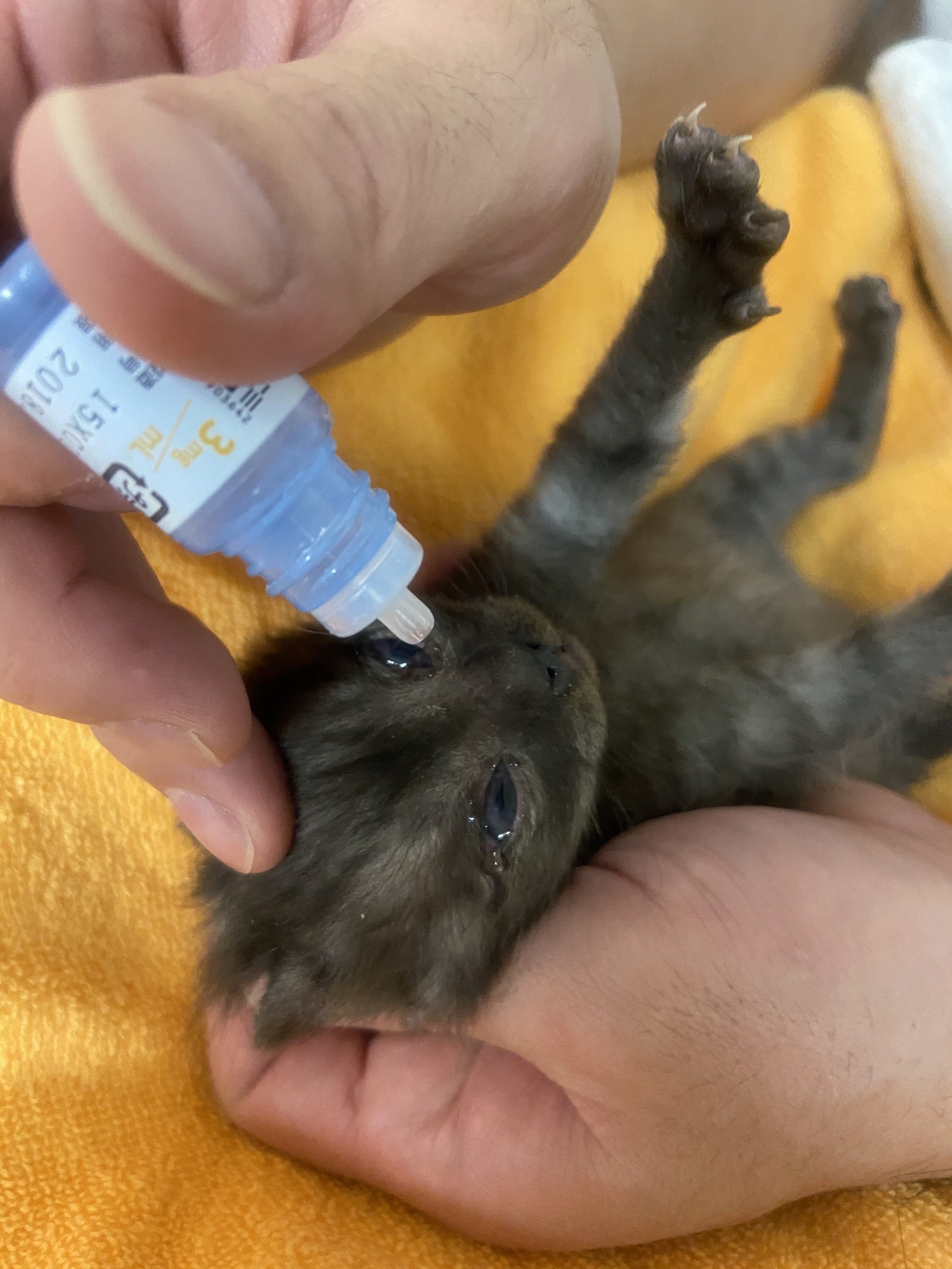 風邪をひいていて、目やにが出ているので目薬で治療をしています。子猫たちの生きる力には、逆にパワーをもらえます!画像キャプション