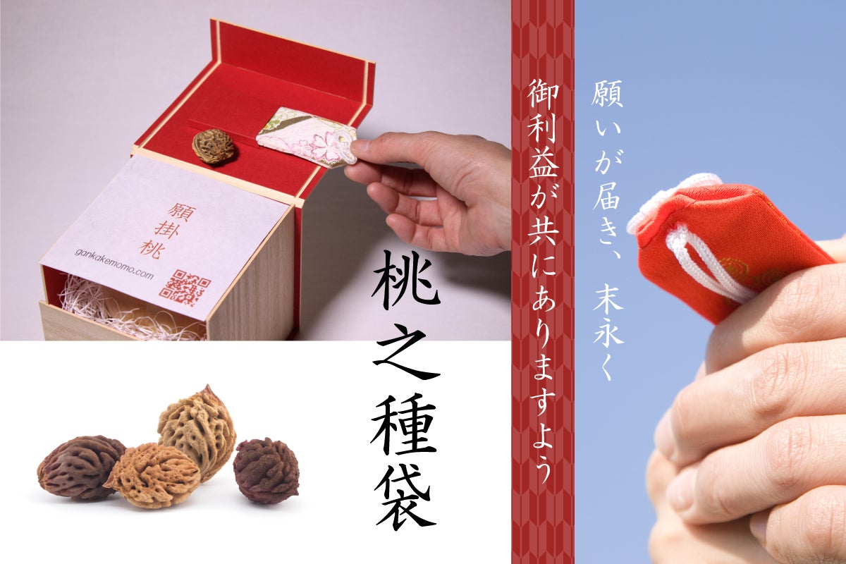 ・付属する「桃の種袋」のデザインは織物職人のかたと協議中ですので、決定し次第、こちらの活動報告及び願掛桃ホームページ(https://www.gankakemomo.com )にてご報告差し上げます。