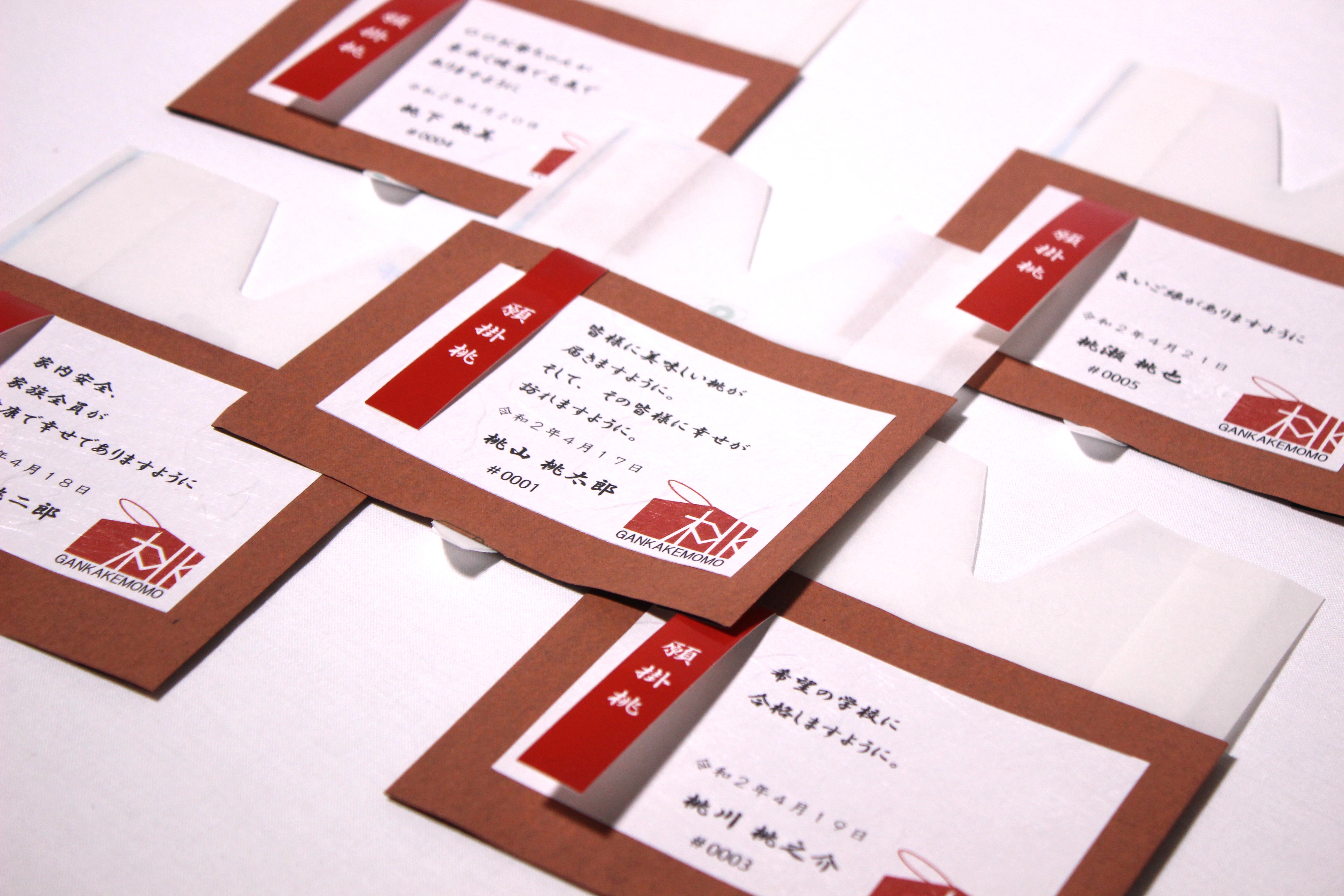 「願掛桃EMA」では、 先述の「果樹袋」に皆様からお預かりした願いを記載し、桃農家が大切に桃の木に農作業として無事に願いが成就されるよう祈りながら掛けさせていただきます。受験を控えたお子様の合格祈願や、おじいちゃんおばあちゃんへのご長寿祈願など、皆様それぞれのお願い事をお預かりいたします。