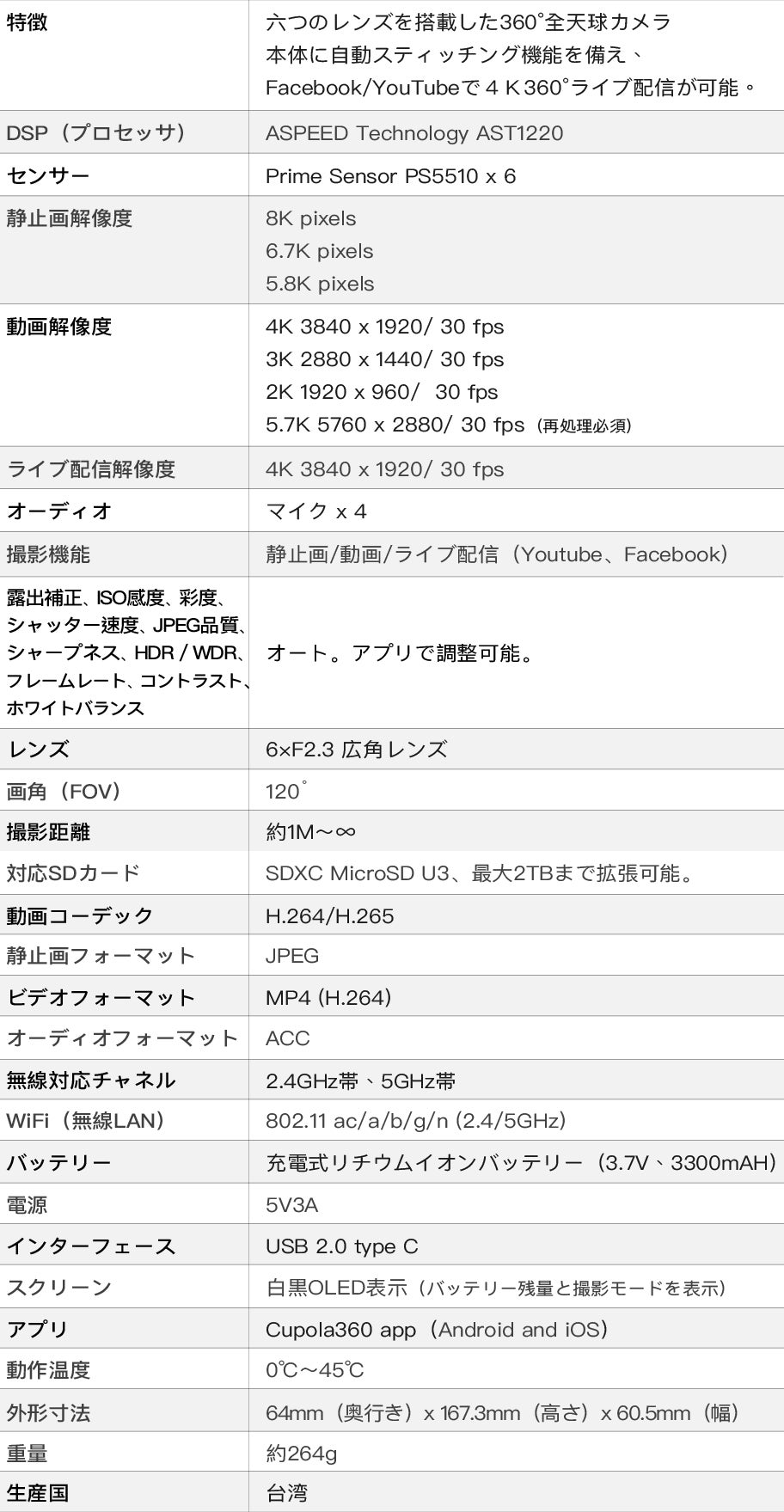 • 六つのレンズを搭載することでゆがみを強力補正• 四つのマイクで臨場感あふれる360度オーディオを実現• 最⼤2TBまで増設可能• スマホやPCを通さず、本体だけで4Kの360度ライブ配信• 最⻑8時間までライブ配信可能• 自動的なスティッチング処理もカメラ任せ