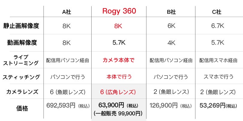 69万円の360度カメラのようなプロレベルの性能を持つにも関わらず、価格はわずか他社の1/10程度です。 こんなコスパ最高なRogy 360で、360度の世界に足を踏み入れてみませんか?