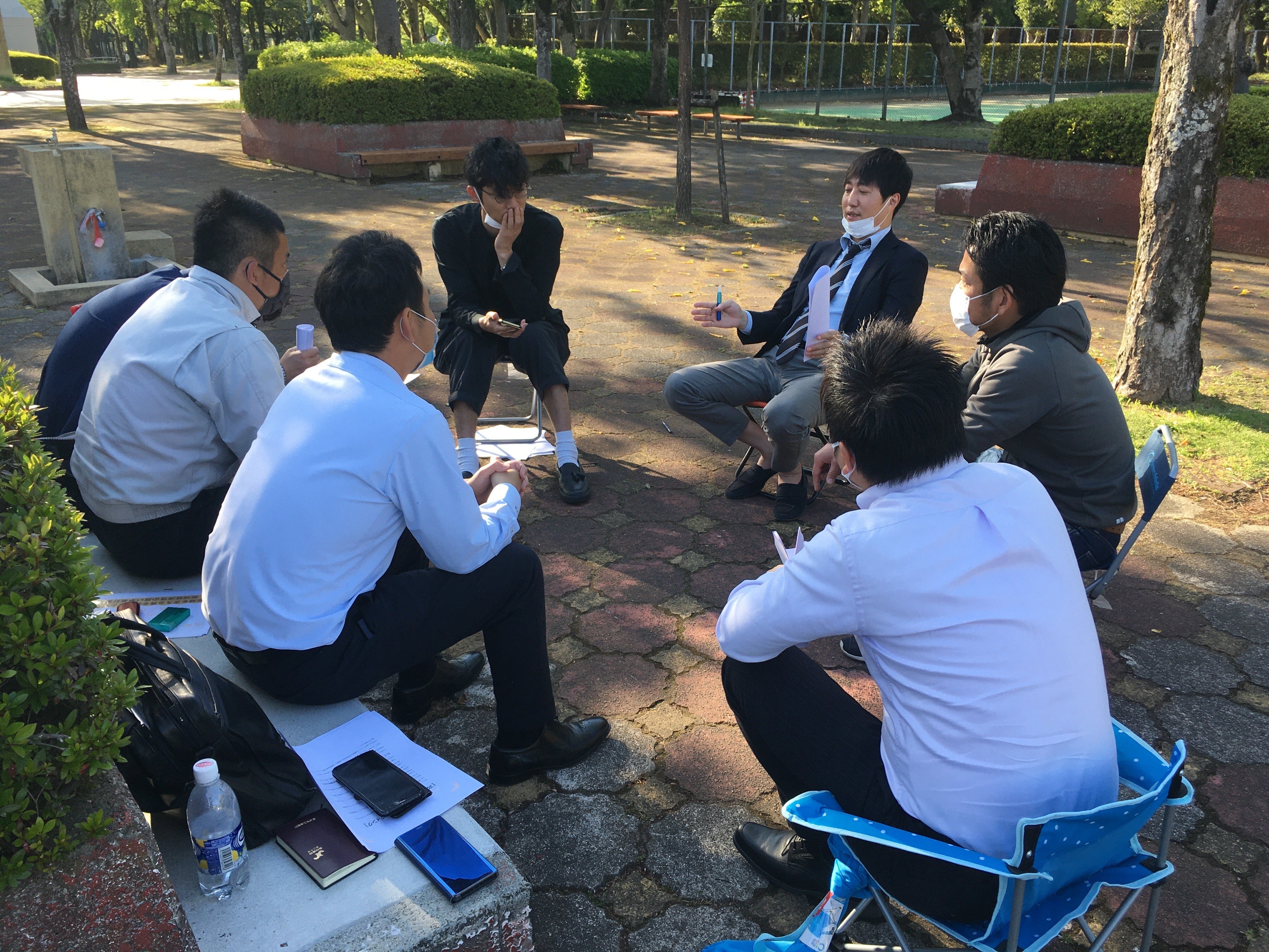(実行委員メンバーは、屋外で距離をとってミーティングを行っています)