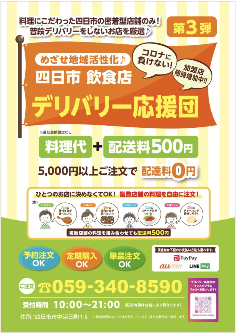 2020/05/19 16:14ご報告がございます。おかげ様で加盟店を13店舗まで増やし、本日より第二弾のポスティングを行います!GW以降は少し注文数が減っていますが、リピーター様も増えています。少しづつではございますが、認知度を上げ、もっと皆様から必要とされるものにしていきます!まだまだこれからですが、今後ともご支援の程、宜しくお願い致します。インスタ、Facebook、クラウドファンディングのアカウントの拡散もご協力をお願い致します。【インスタグラムページ】https://www.instagram.com/yokkaichi_delivery_ouendan/?hl=ja【フェイスブックページ】https://www.facebook.com/profile.php?id=100050743839473【クラウドファンディングページ】https://camp-fire.jp/projects/view/257967↓5月19日からの加盟店 ご注文の際は059-340-8590までお願いします(料理代+配送料500円)※三重県四日市市の近鉄四日市から半径3kmが配送エリアとなります。 それ以外のエリアも一部配送可能ですので、お気軽にお問い合わせください。 もっと見る