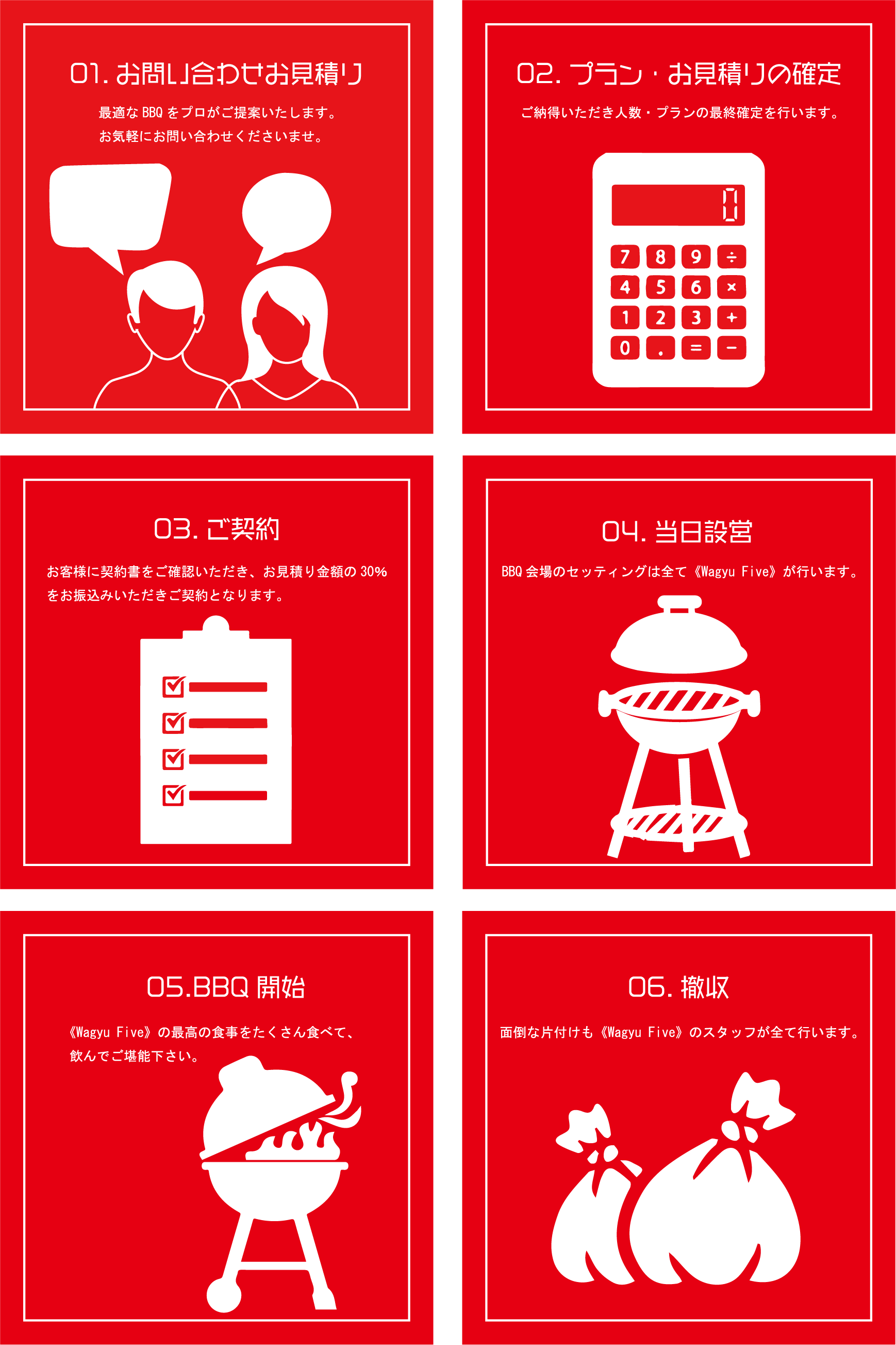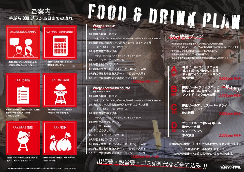 高価なバーベキュー機材の購入や、当日の面倒な準備を全てWagyuFiveがセッティングし、最後のゴミ・片付けまでWagyuFiveが全て行います!