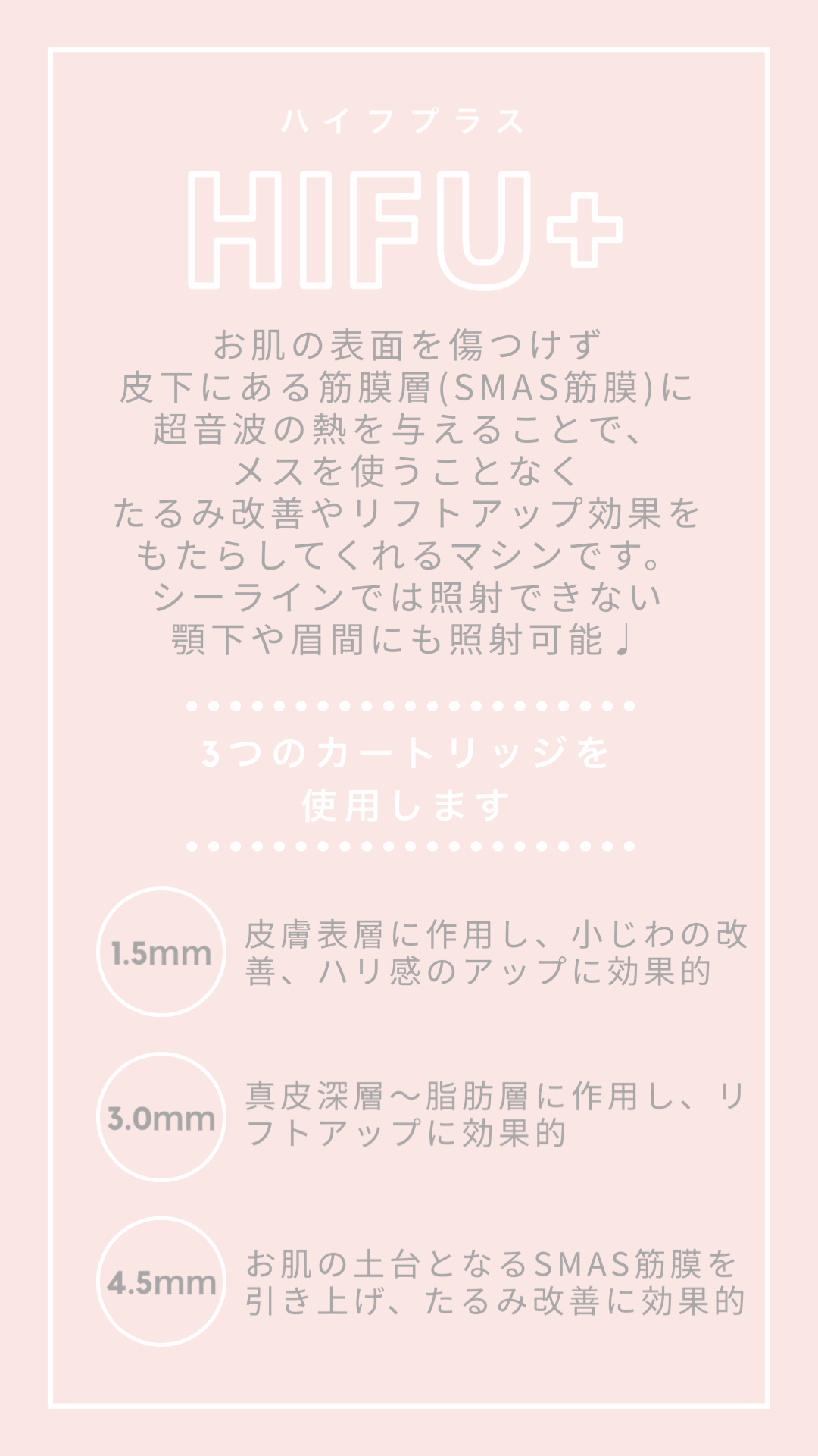 小じわができやすい表皮層、コラーゲンやエラスチンなど線維芽細胞のある真皮層、たるみの原因となるSMAS筋膜へ特殊な超音波をあてることで、メスを使うことなく小顔効果が期待できる施術です。