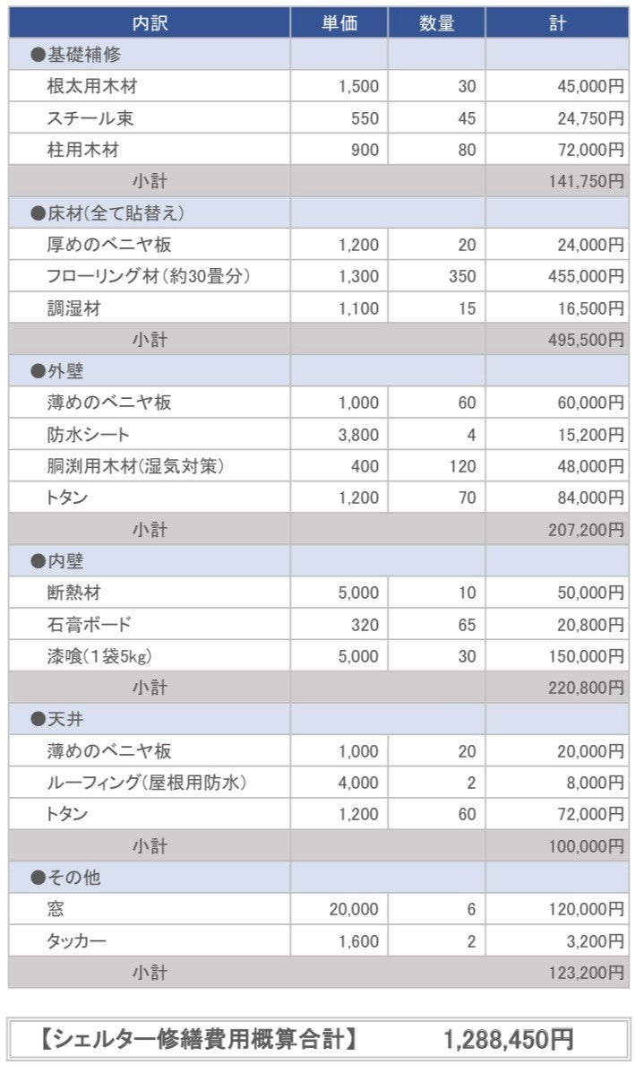 初めてほとんどゼロからの家づくりをすることもあり、やりながら必要な資材が前後しますが毎月領収書の画像とともに収支報告させて頂きます。