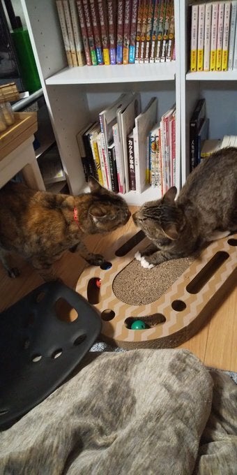 そしてずんちゃんはというと社交的な性格なので心配はしていなかったけどその図々しさから先住のお姉さん猫に少し怒られつつちょっとずつ距離を縮めているようです。