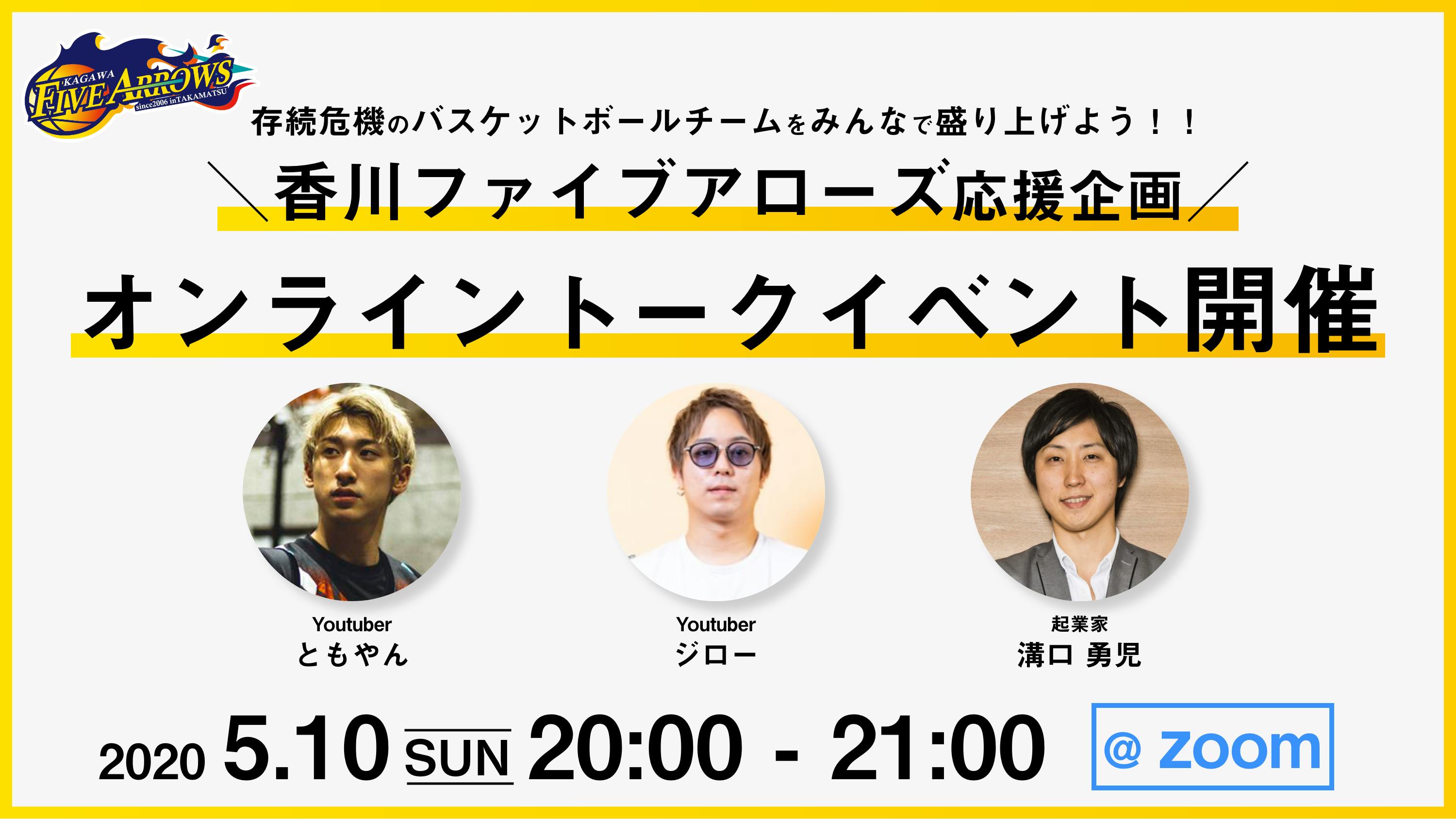 5/10(日)20時より、香川ファイブアローズ 応援企画として、 「Youtuber ともやんさん」・「Youtuber ジローさん」・「起業家 溝口勇児さん」による オンライントークイベントの開催が決定致しました! zoomにて無料で視聴できますので、ぜひともご参加くださいませ。