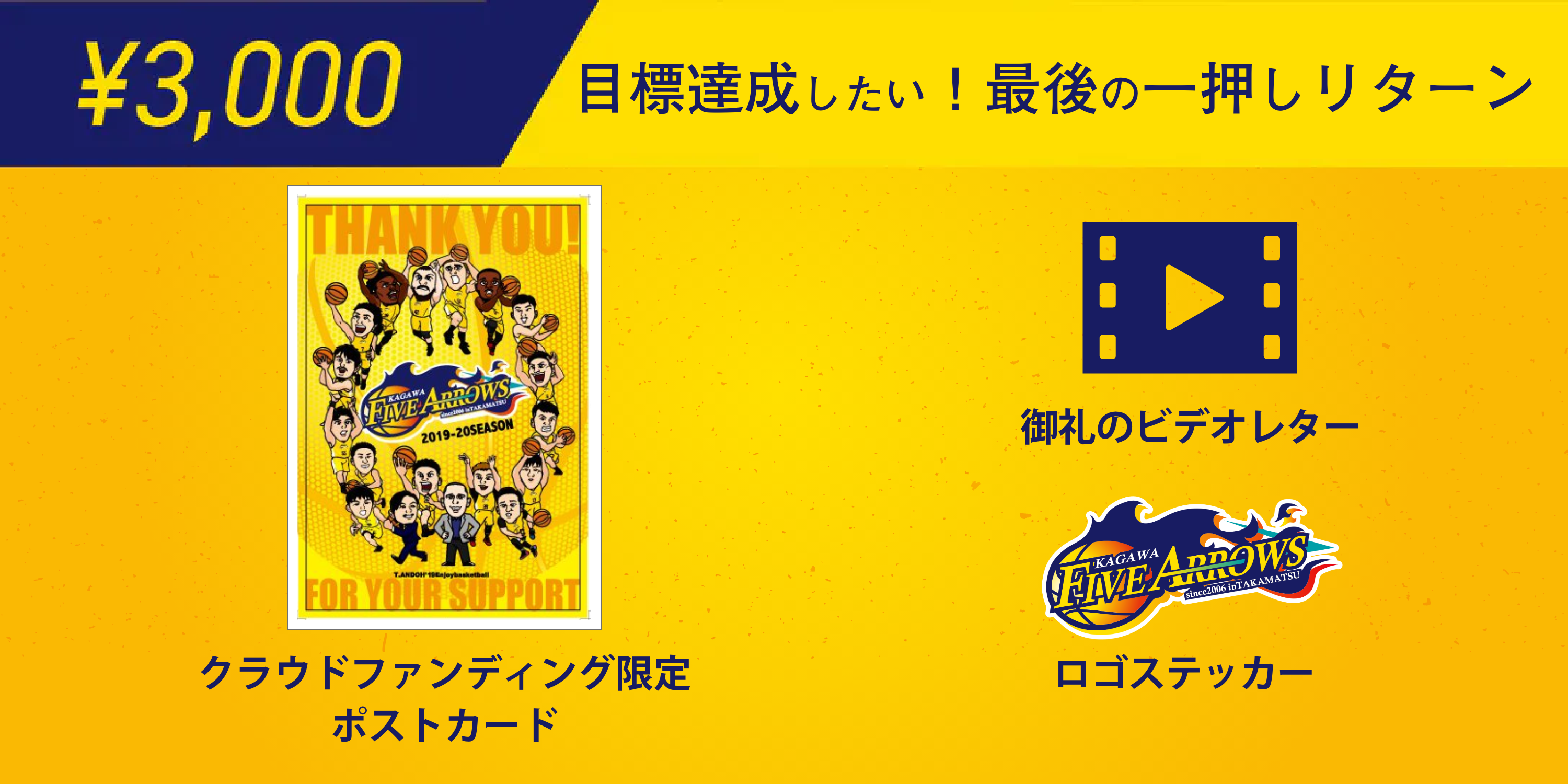 香川ファイブアローズのフロントスタッフをしております、藤井と申します。残りラストスパートということで、現場で感じている想いを、こちらの活動報告にて綴らせてください。4/15より、始まったクラウドファンディングですが、皆様のご支援のおかげで、現在700万円まで支援金額が集まっております。まだまだ先を見通すことができない世の中ですが、香川ファイブアローズクラウドファンディングが目標を達成することでバスケットボール界、そして香川県を元気づけることへの第1歩を踏み出せると感じています。すでにご支援いただいた皆様の思いをさらに大きなものにするため、あと少し力を貸していただければ幸いです。クラウドファンディング終了まで残りあと12日。目標金額の1000万円を達成するため、3000円の『最後の一押しリターン』を新設させて頂きました。一度支援していただいた方も、最後の一押しを何卒お願いします。バスケットボールで世の中を元気にするため、皆様と共に目標を達成したいと思います!!◉クラウドファンディング限定ポストカード香川ファイブアローズの選手たちが可愛くデフォルメして描かれたクラウドファンディング限定デザインのポストカードになります。◉御礼のビデオレター選手からの御礼のビデオレターをお送りいたします。◉香川ファイブアローズ公式ロゴステッカーロゴステッカーを差し上げます。
