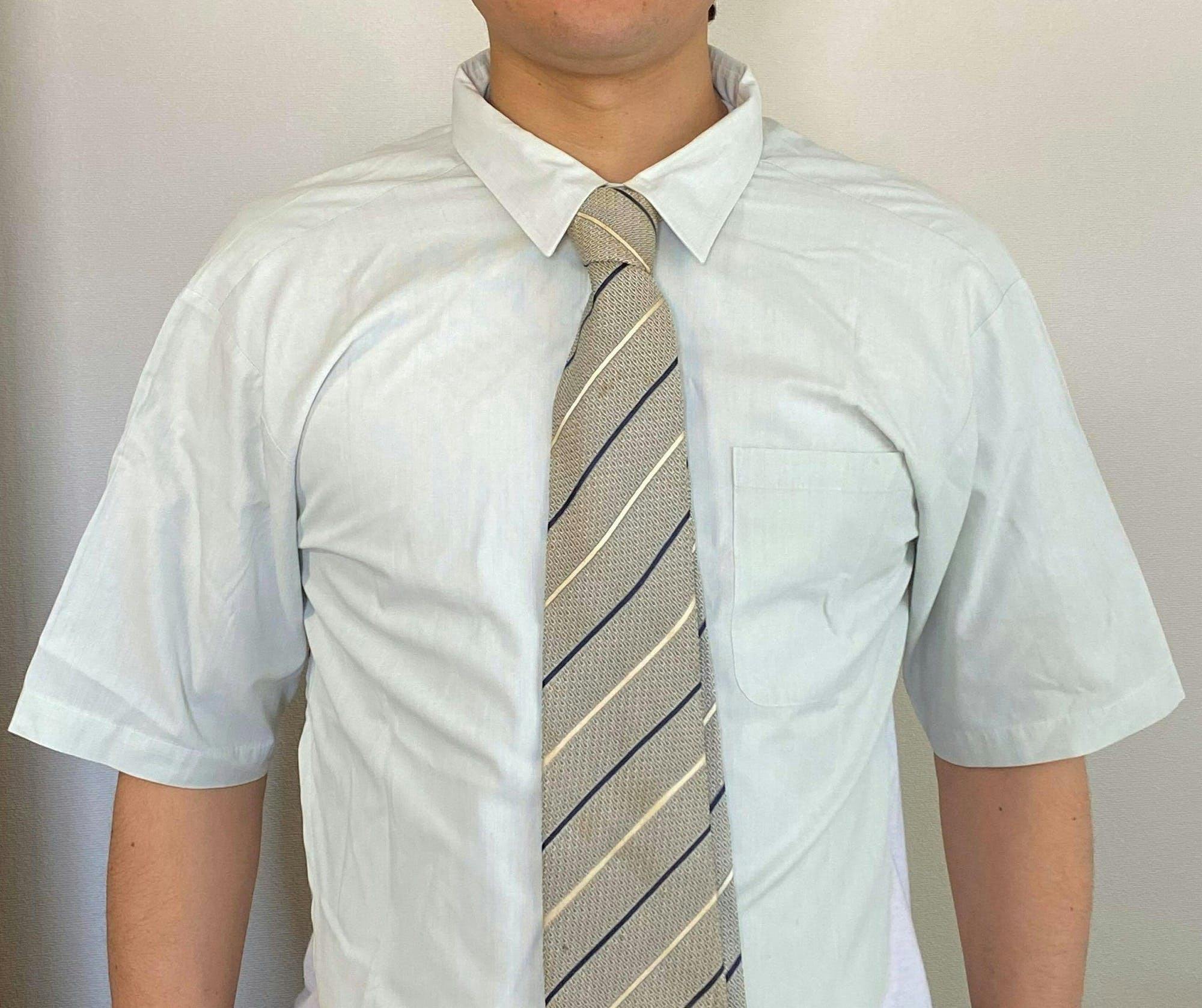 前面のネクタイはYシャツに縫い付けてあります。毎朝鏡を見ながら結ぶ必要はありません。