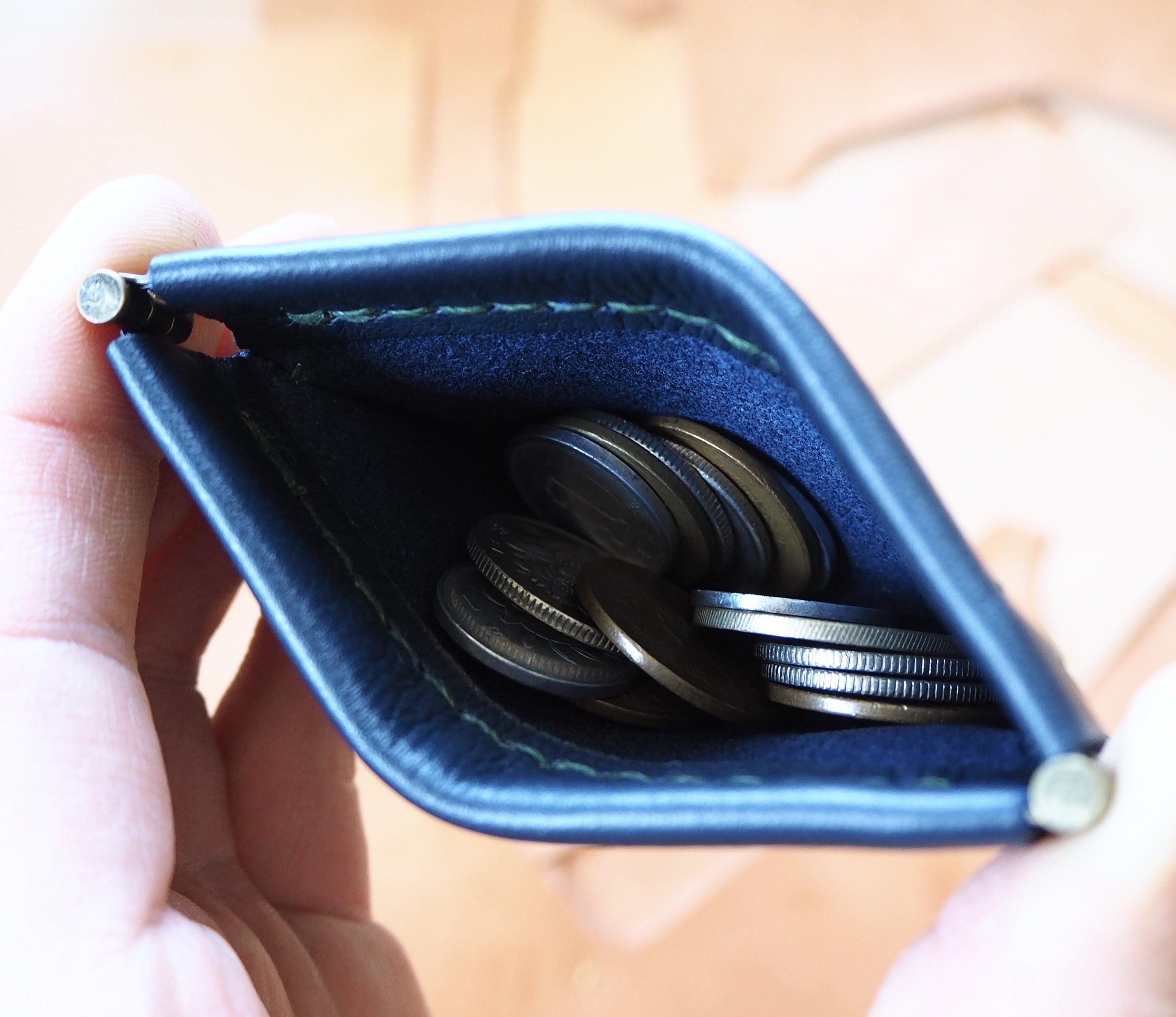 この小銭入れは小型ながら比較的ハリの少ない柔軟な革を使用することで小銭をスムーズに入れられるようになっています。