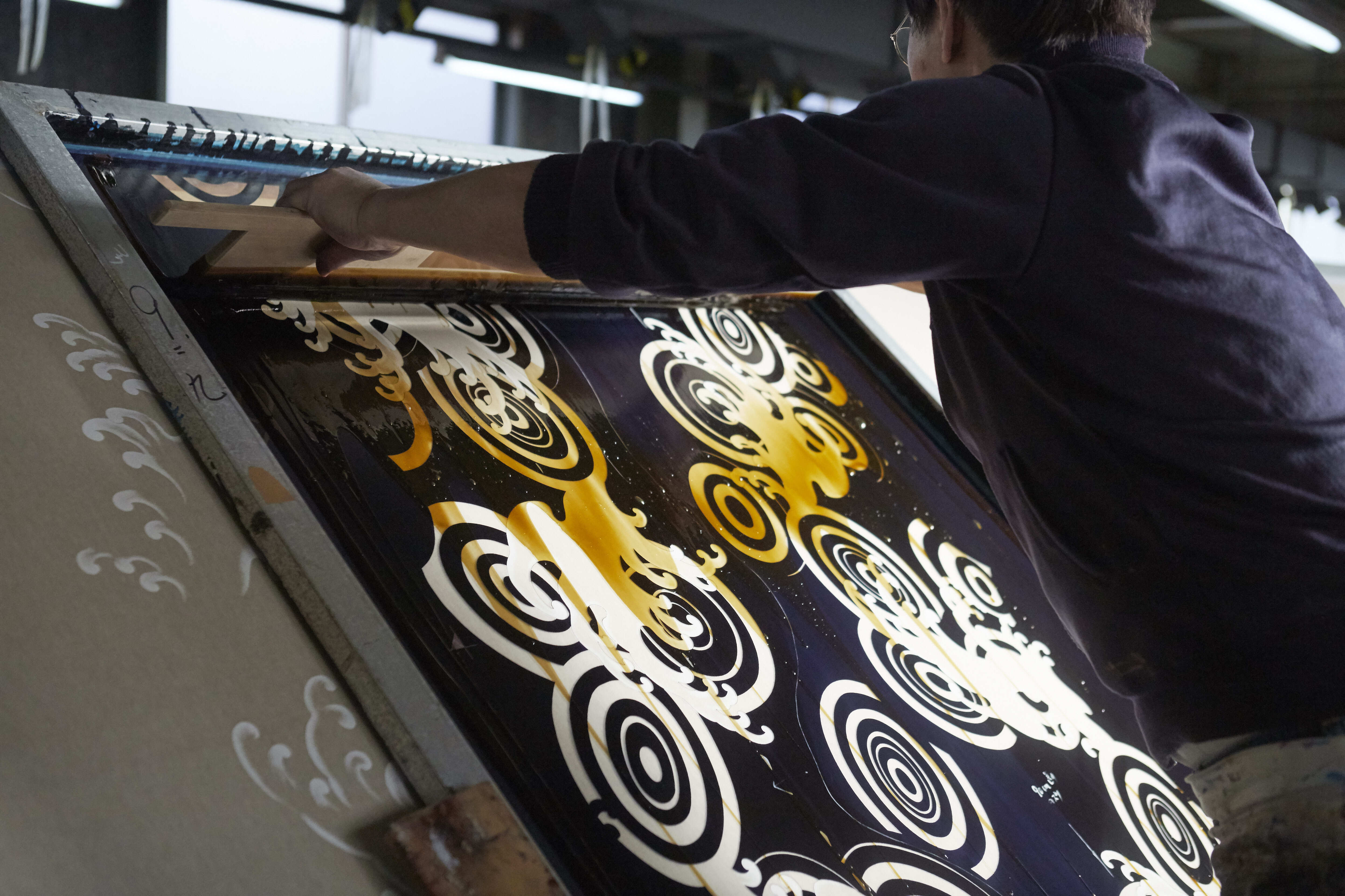 世界に誇る日本人アーティスト・葛飾北斎の神奈川沖浪裏の大波をアレンジして友禅染めで復刻しました。波の力強さ、永続性にフォーカスして波がミニマルで繋がるように型を製作しました。