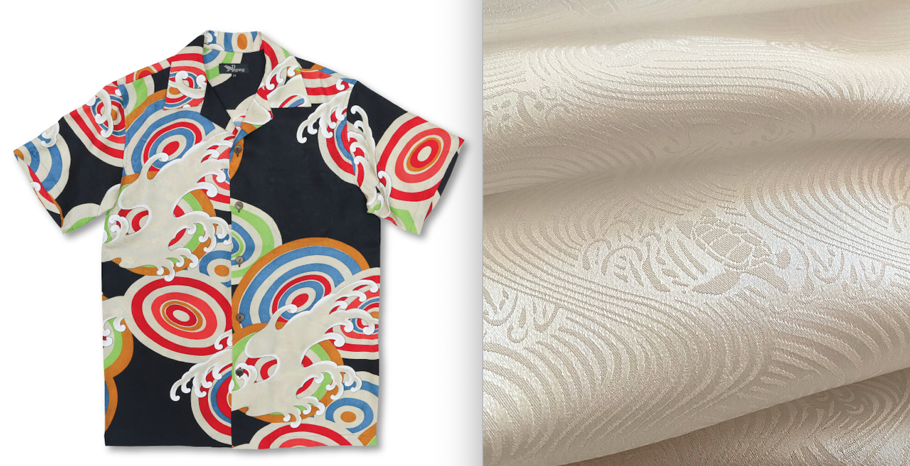 それでもなんとか着物の図案と友禅染めの美しさをもう一度世の中の人に知ってもらいたいと、試行錯誤を繰り返し、アロハシャツの起原がハワイへ移り住んだ日系人が持ち込んだ着物にあることを知りました。