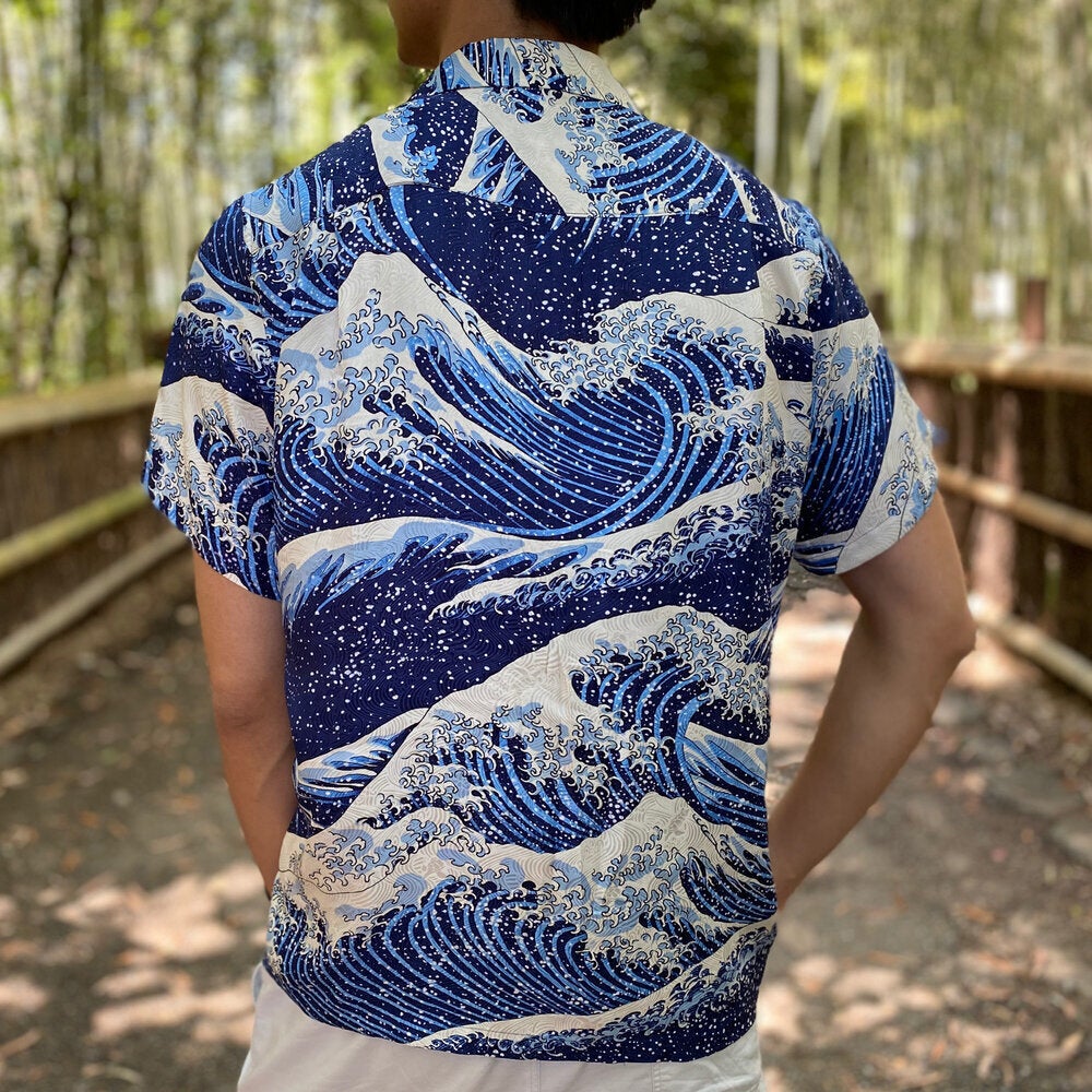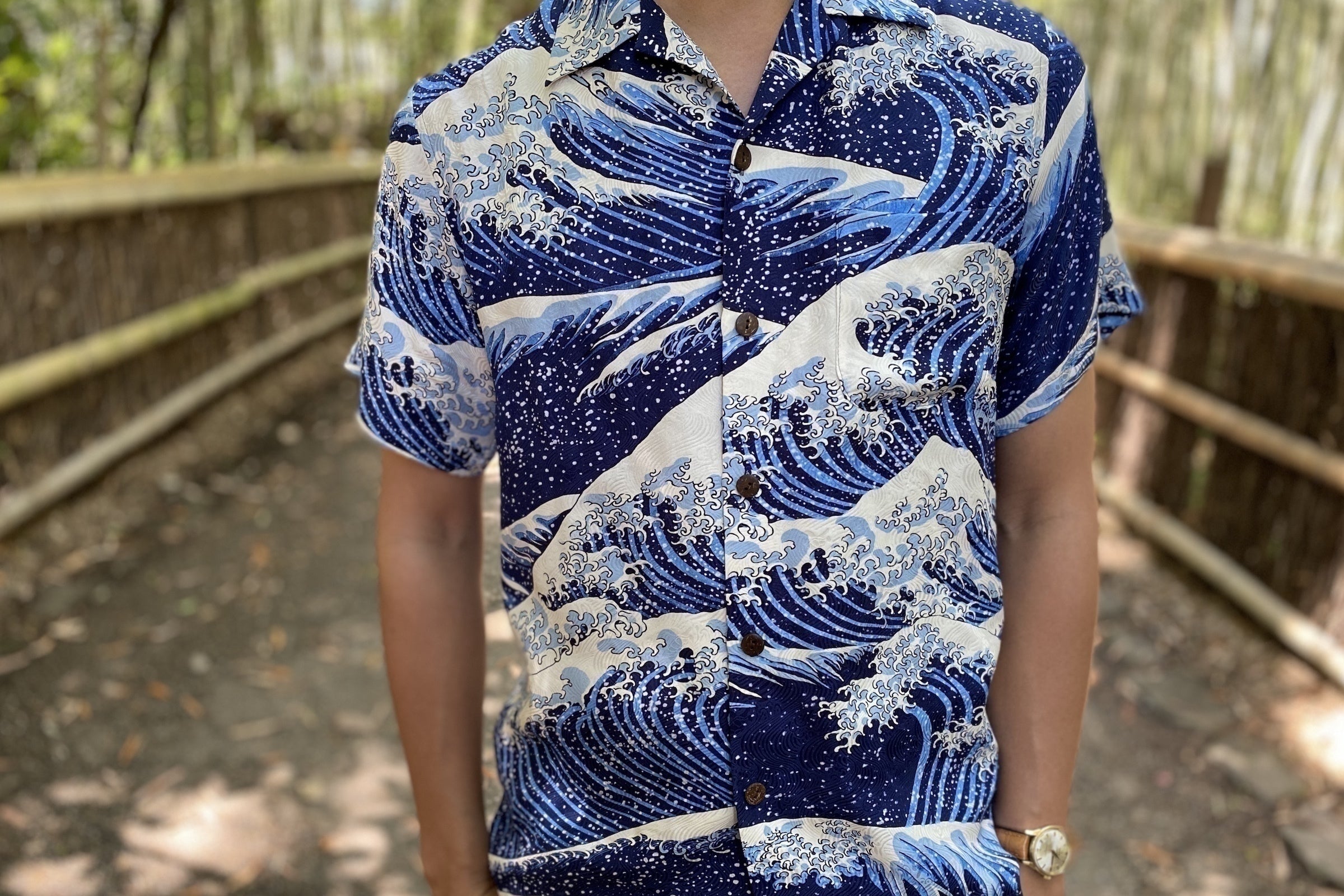 京友禅アロハシャツは、亀と波の模様の入ったオリジナルのシルク100%生地に染めています。
