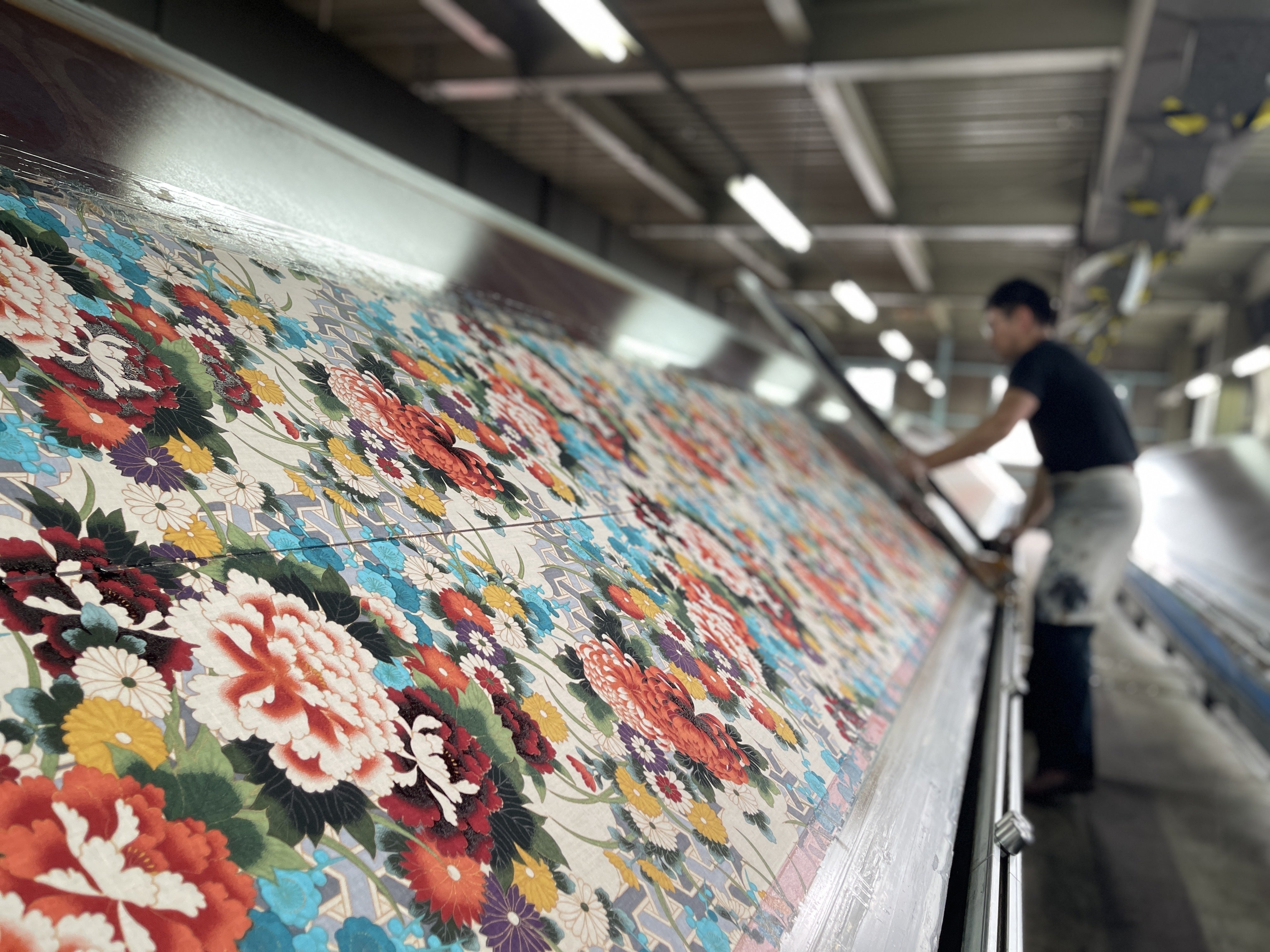 蒸されて初めて染料が熱に反応して、生地に染まります。