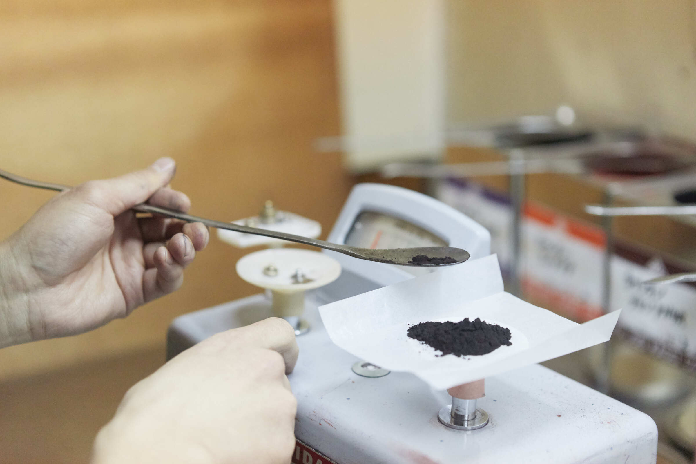 細かいミリグラムまで正確に計る為に、今も分銅を使って計っています。