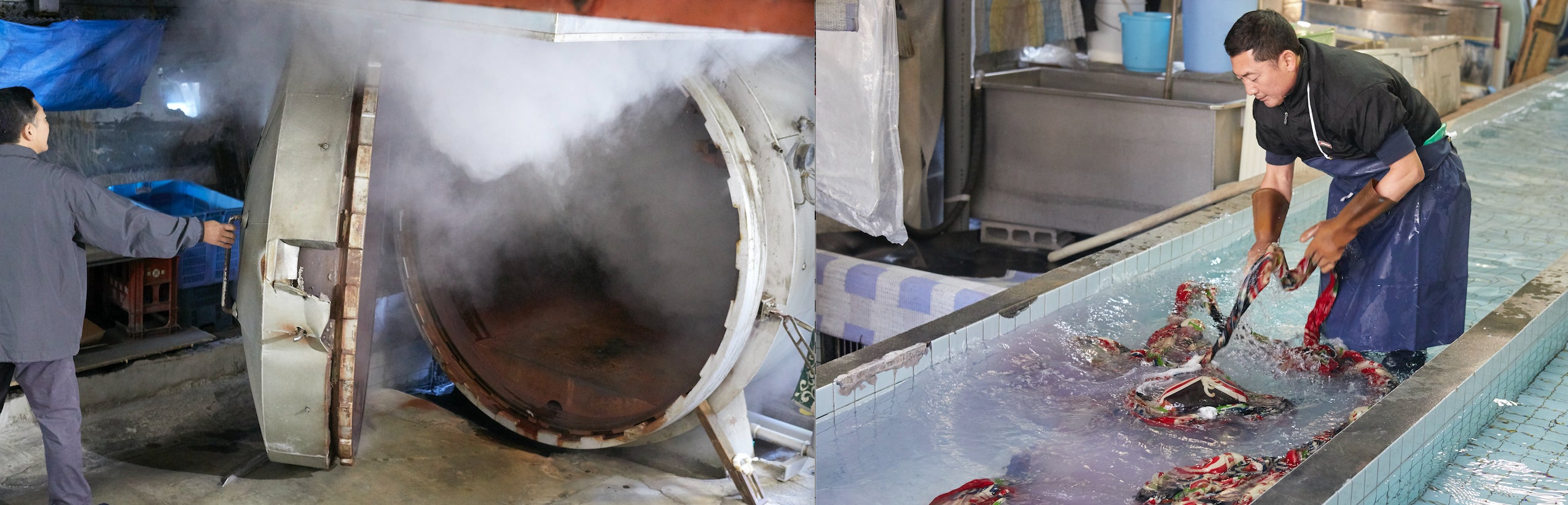 染めた生地はその後、蒸し屋さんに運ばれ200度の釜で蒸されます。