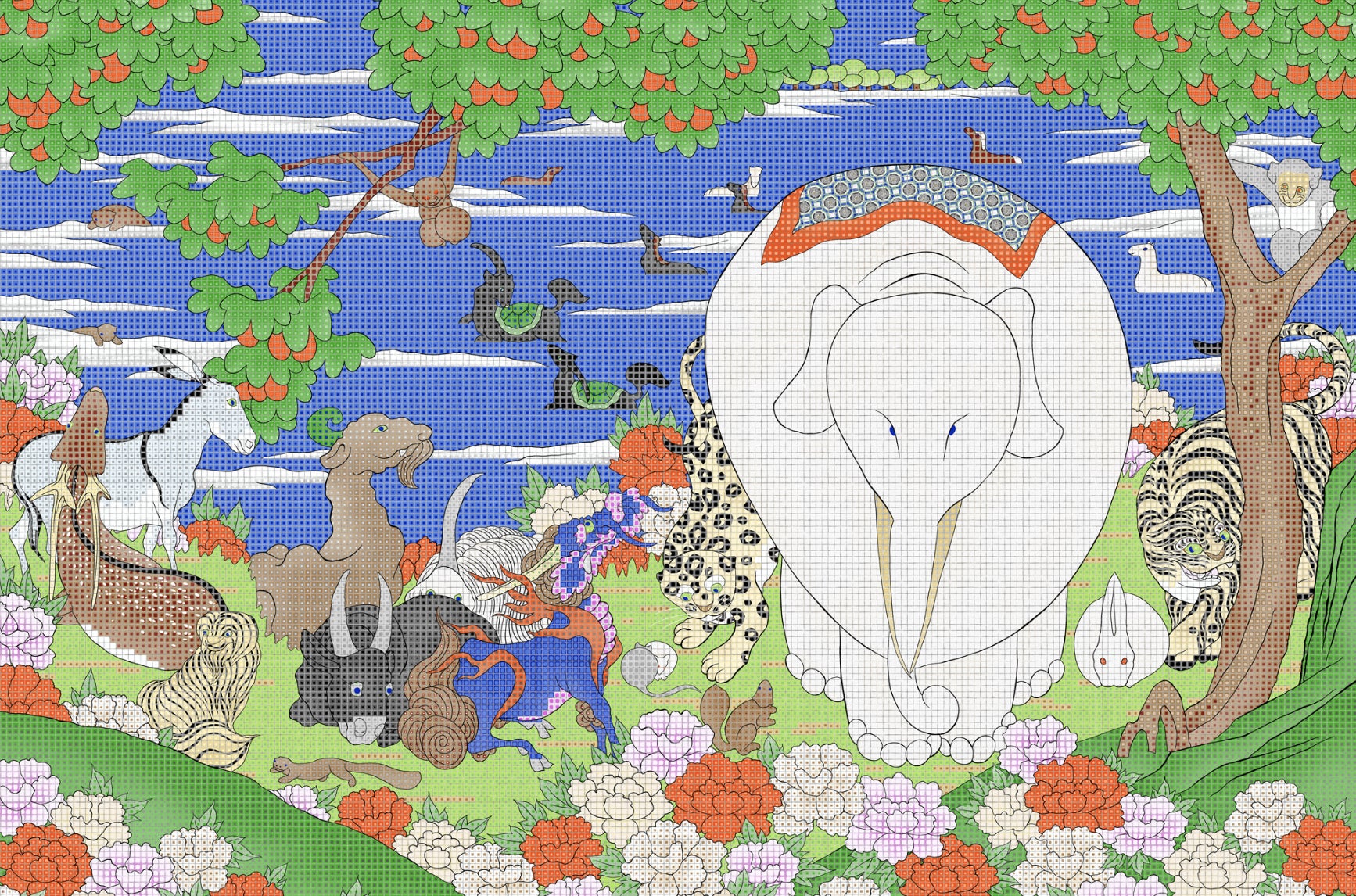 白象をはじめとした愛らしい動物たちが「桝目描き」と呼ばれる特殊な描法で描かれるこの柄は若冲の独創性が感じられる作品として注目を集めています。桝目描きと呼ばれる、タイルのような表現技法は友禅染めでは抜染技術を使うことで表現しました。型枚数23枚に及ぶ大作になりました。23色の染料を使い染めています。