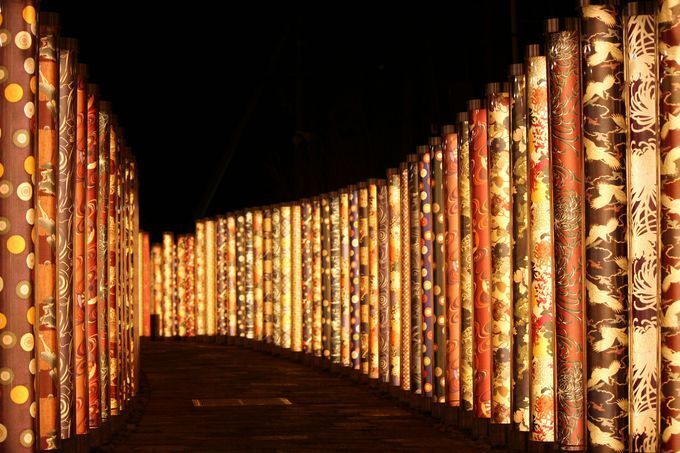 京都の観光名所の一つ、嵐山の駅には、【キモノフォレスト】と呼ばれるスポットがあります。パゴンが染めた京友禅のポール600本が並び、中にLEDライトが入っており、夜は幻想的な雰囲気を醸し出しています。