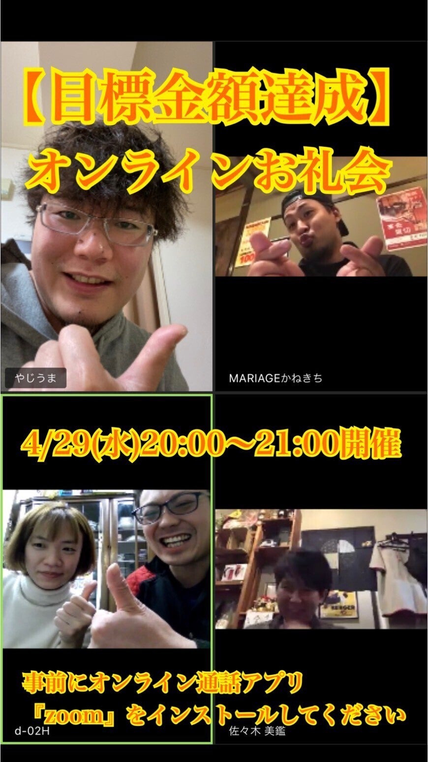 お陰様で目標金額に達する事が出来き、さらになんと100人以上の方にご支援を頂き、誠にありがとうございます。そこでお礼をする場を設けたいと思い通話アプリ『zoom』にてお礼会を開催させて頂きたいと思います。