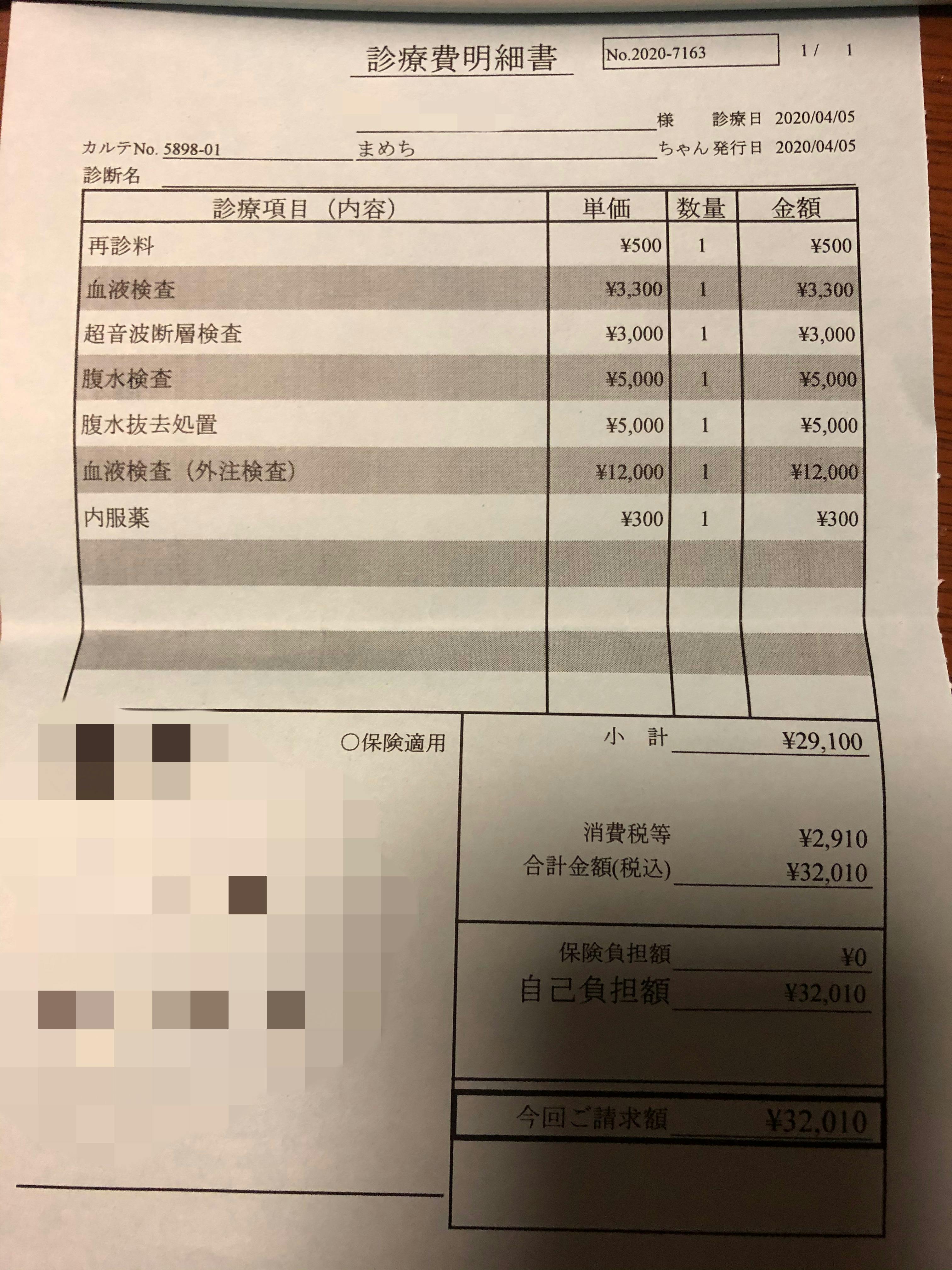 そしてお医者様からは「 命に関わる病気の可能性があります。」と言われ、すぐにFIPの抗体価数値を調べる検査をしました。しかし結果は800倍、とグレーゾーンだったので、4月5日に腹水を抜き、遺伝子検査をしました。