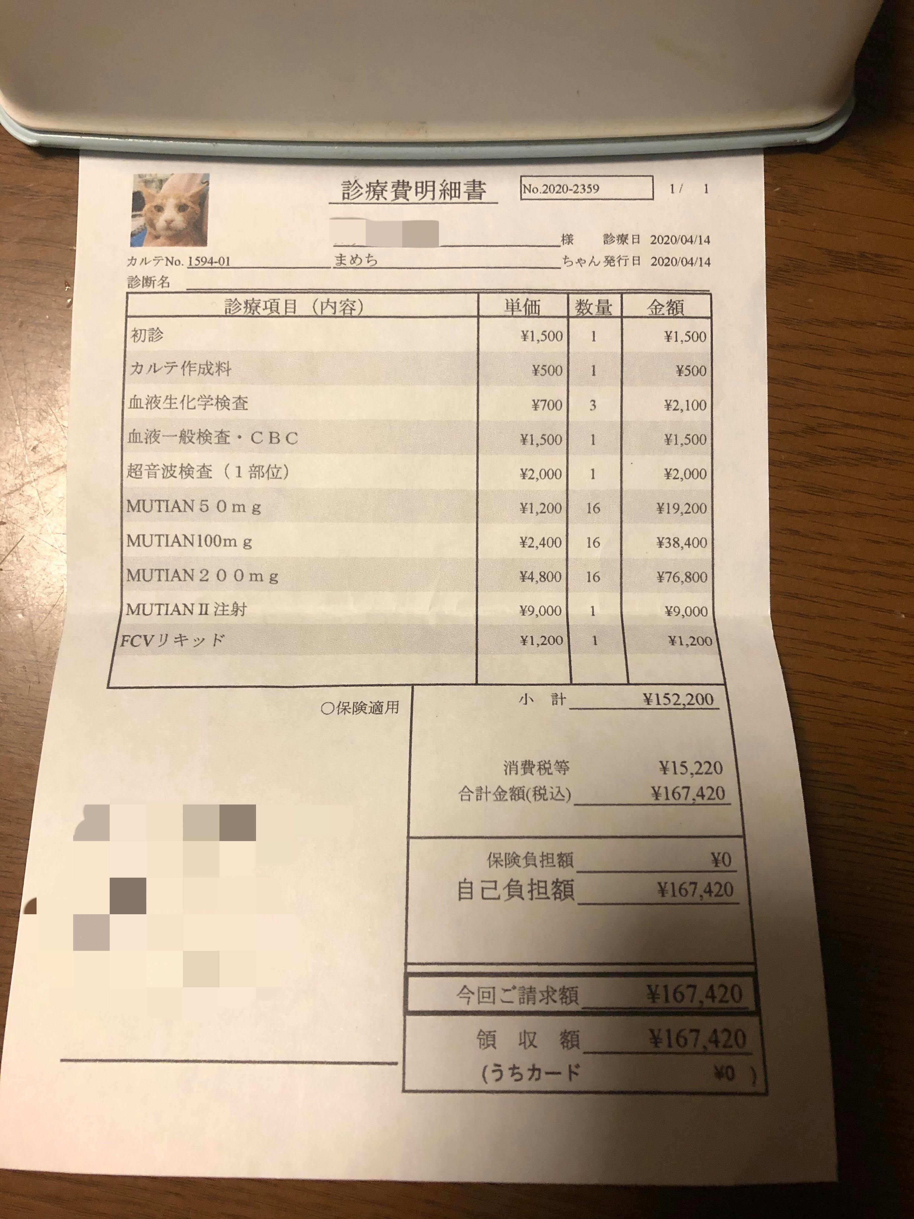 一刻も早く投薬を始めなければいけない状況だったため、4/14にMutianを16日分購入し、その日は病院で注射による投薬をして頂きました。自宅での投薬は4/15から始めるので、投薬状況や血液検査、エコー検査の結果また出資明細は「活動報告」、Instagram(@mameti_fip)やTwitter(@mameti__)でも随時ご報告させて頂きます。