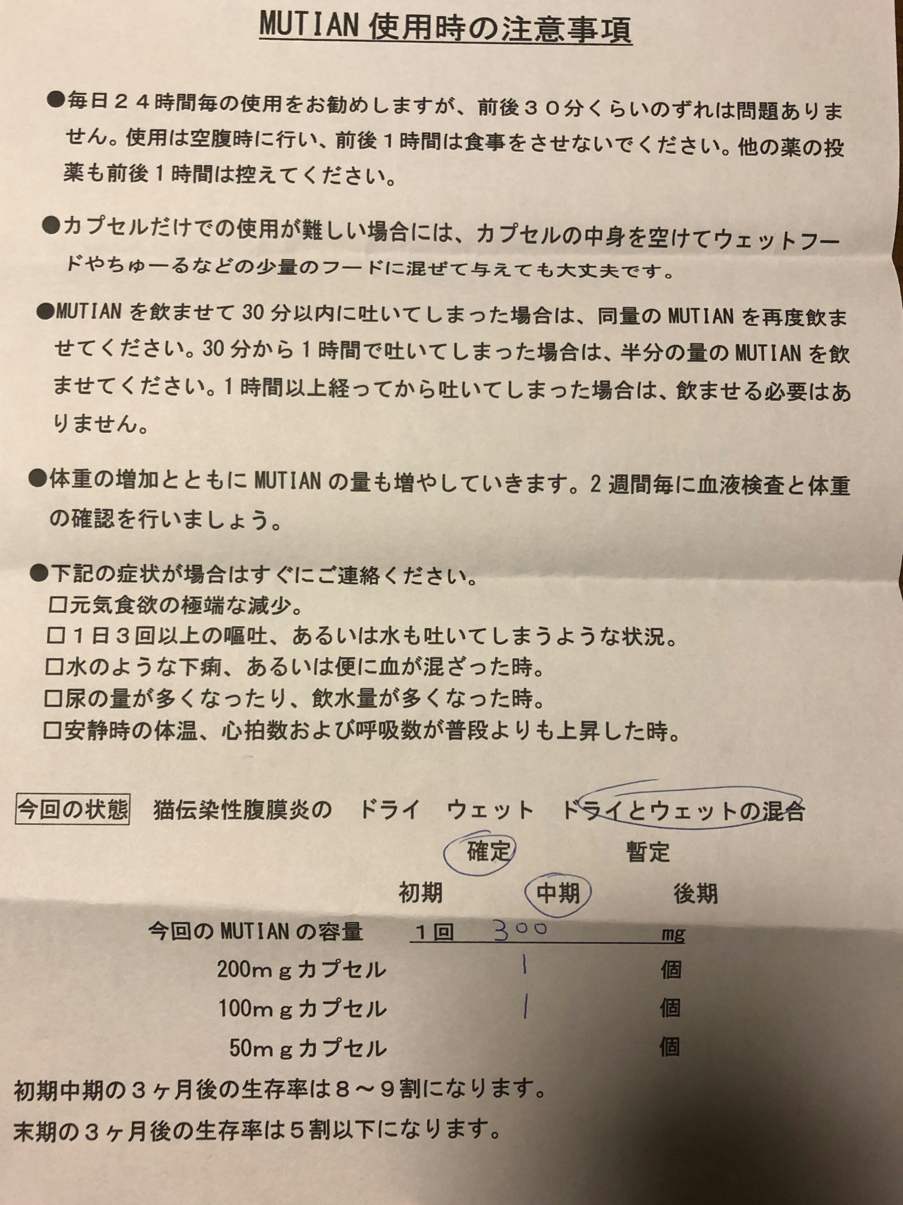 Mutianは原則12週間連続投与が絶対条件であり、2週間に1回行う体重計測と検査の結果によって、投薬する量が変わっていきます。また途中で中断したりすると、1週目からやり直しになってしまいます。そして12週間の投薬が終了したのち、血液検査等の結果で正常値を保つことが出来ていると、FIPが再発しにくくなり、完治という事になります。
