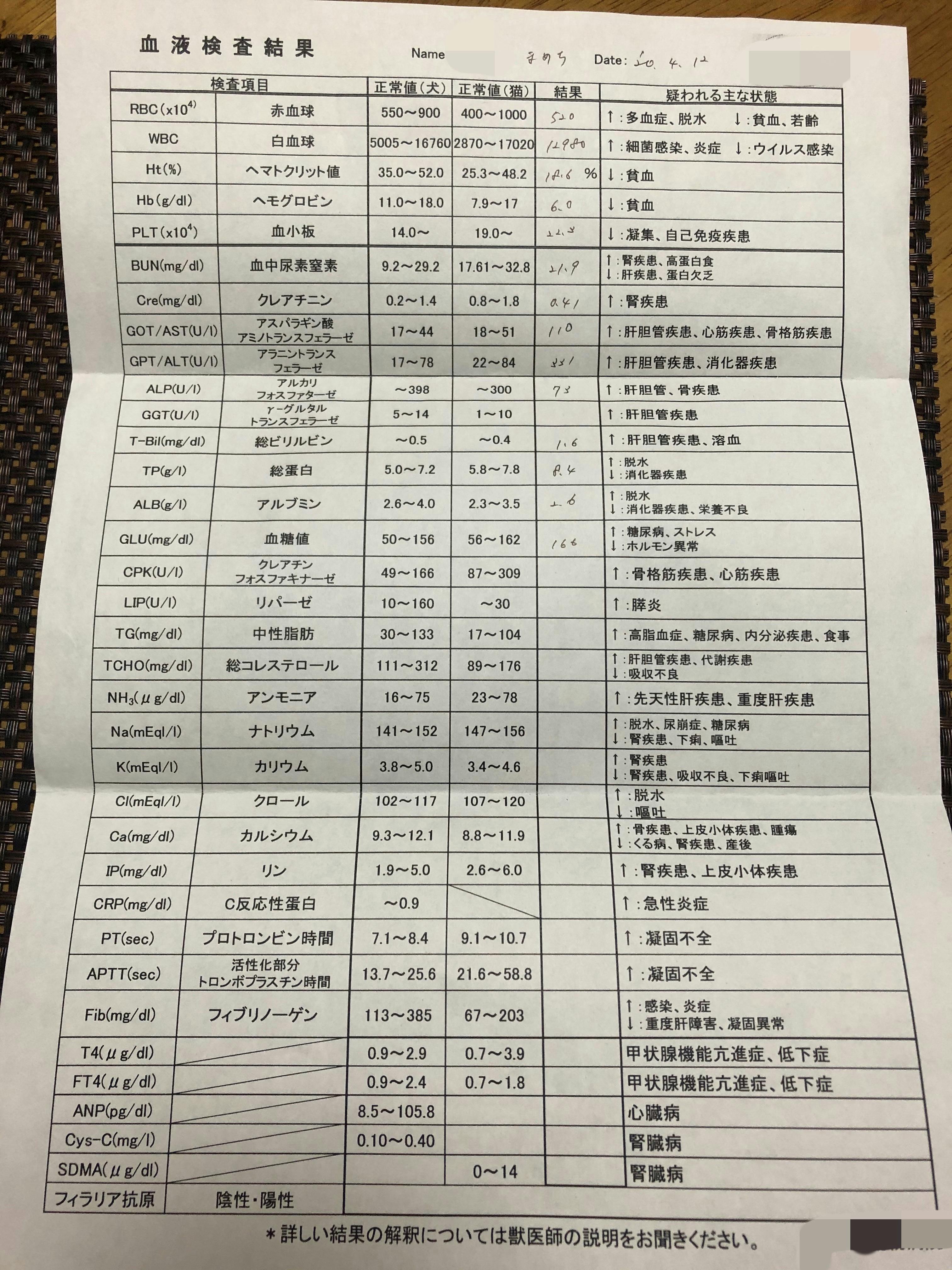 ↑かかりつけの病院での検査結果 前回(4月5日)の検査結果と比べると、貧血の数値はよくなっていました。ですが赤血球の数はさらに減少、総ビリルビンと白血球の数は大幅に増加していました。