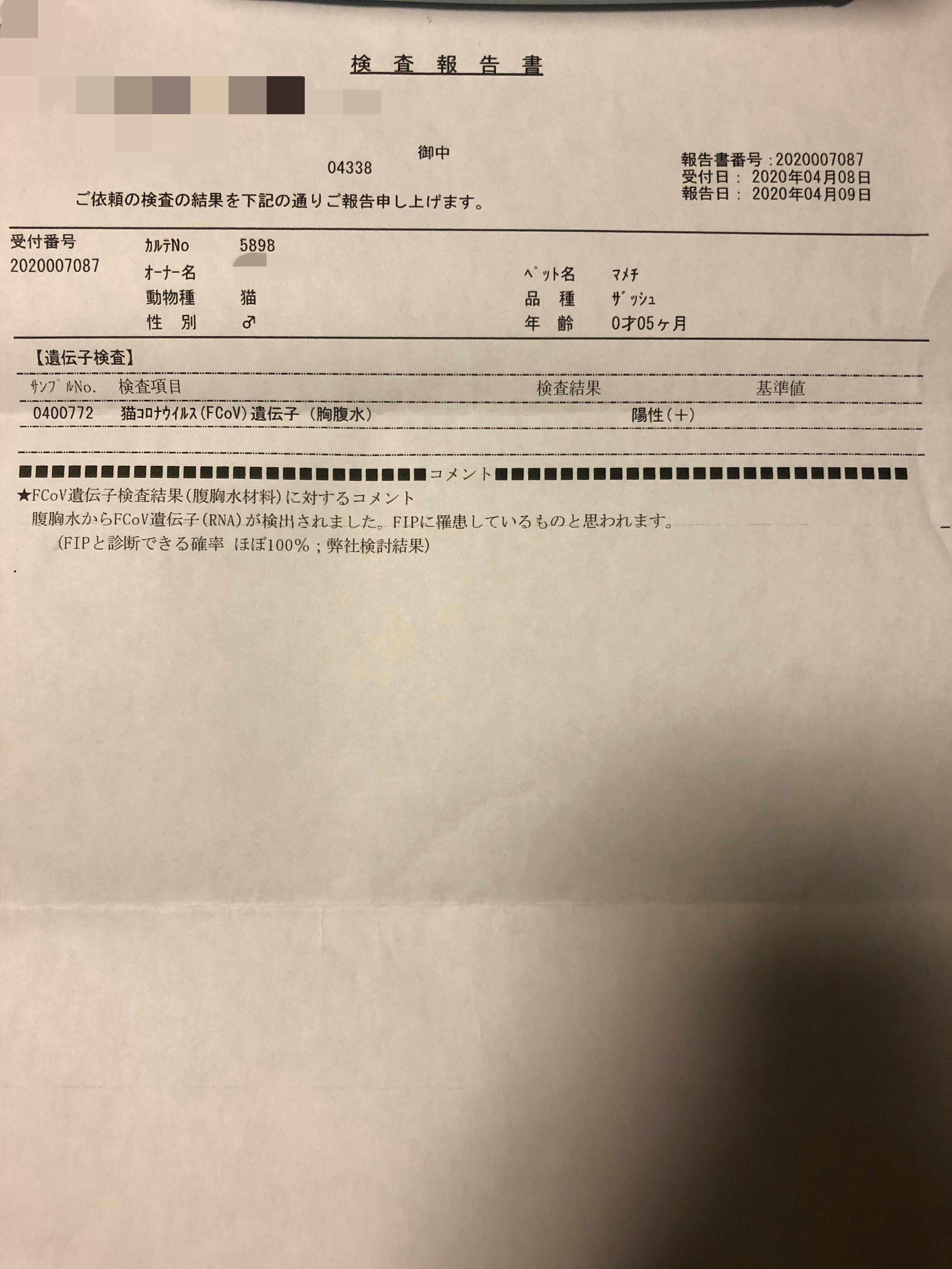 この日は通院予約をしていた日ではなかったので、FIPの検査結果が陽性である、ということを電話で聞きました。こちらは後日頂いた審査報告書です。