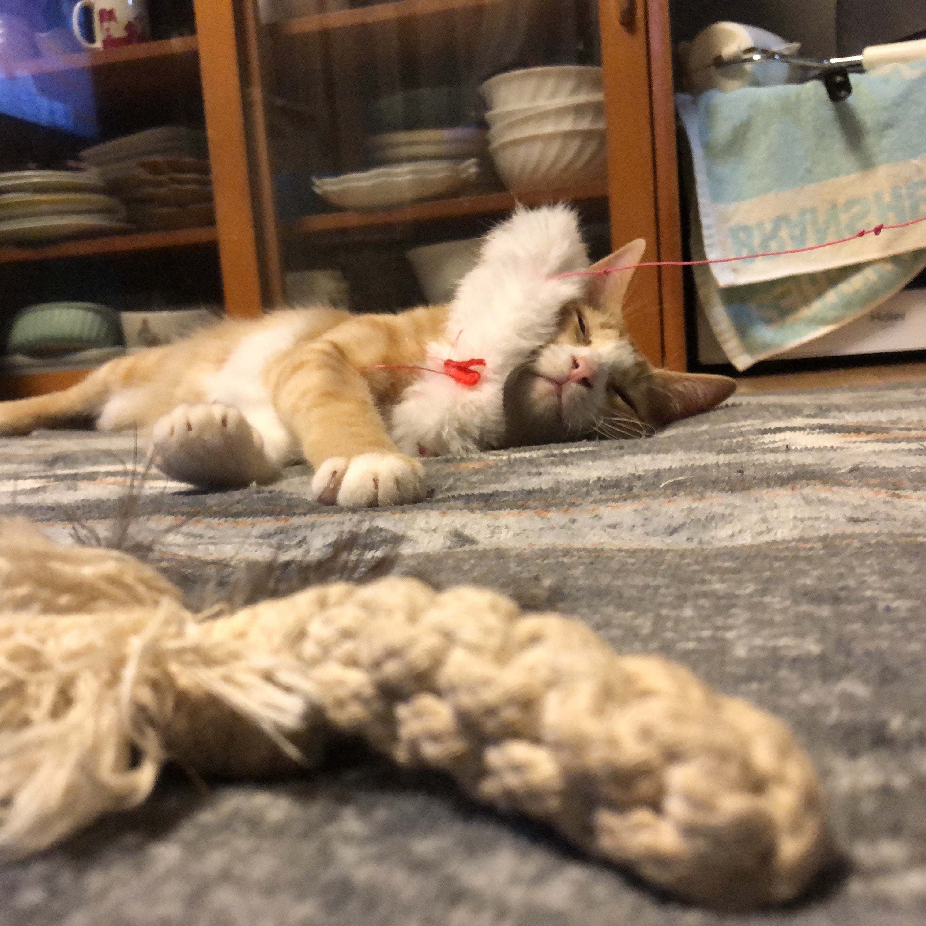 そしてこちらは尻尾のおもちゃとじゃれ合うまめち。