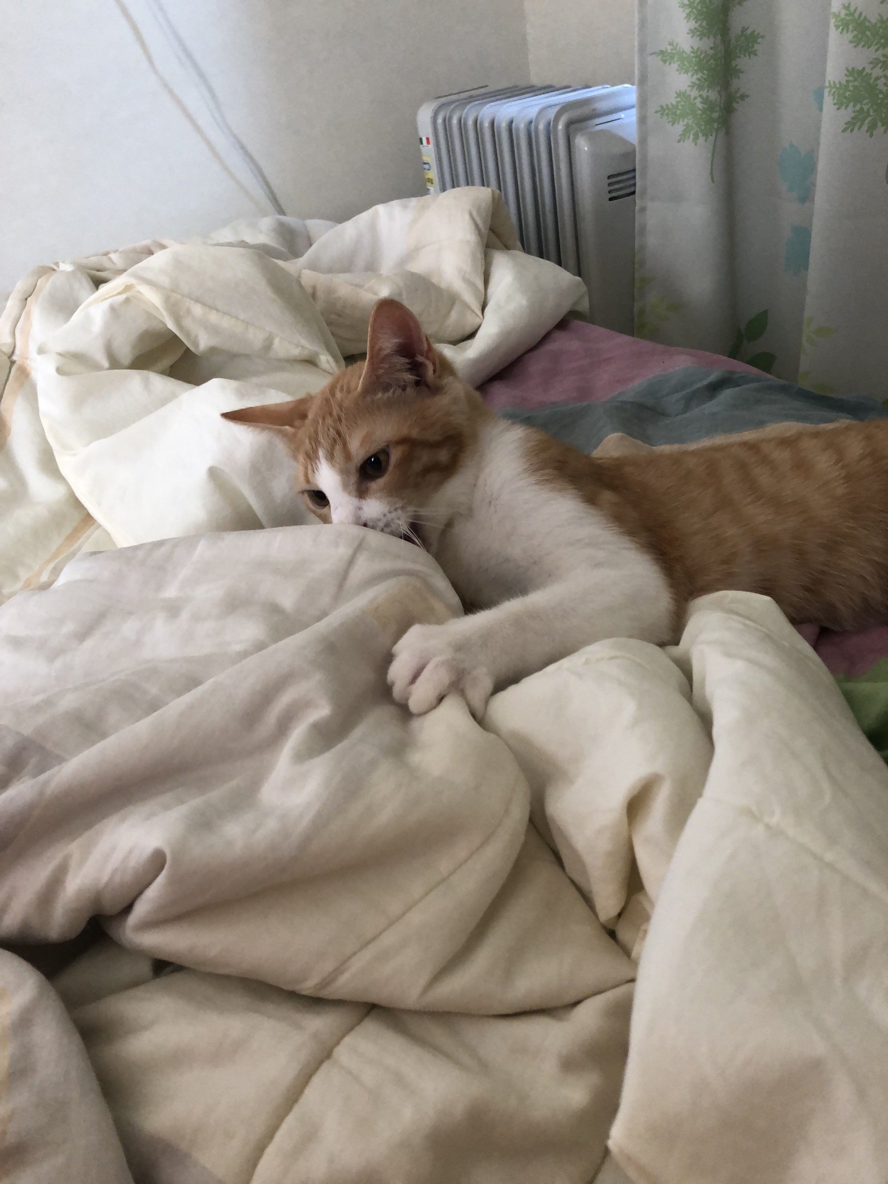 ベッドの上でくつろぐまめち。この後必至で毛布の下に潜ろうとしてました笑